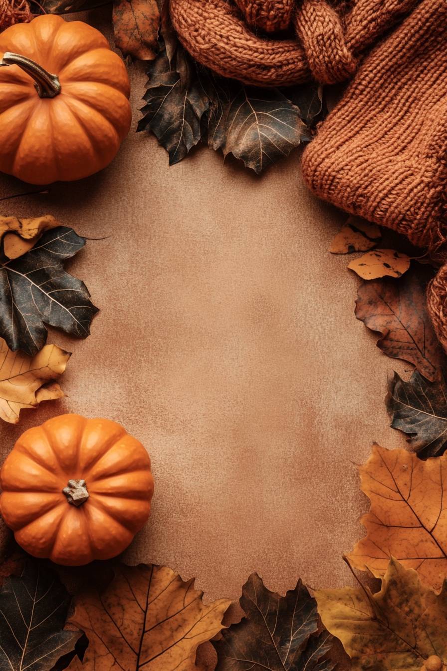 a flat-lay arrangement on an fall-inspired background. Use fall elements like some leaves, two orange pumpkins, knitted fabric on one corner and a lot of empty space in between to evoke a warm, seasonal feel, soft brown clean background with some glittler on the surface, elegant --ar 2:3 --v 6.1