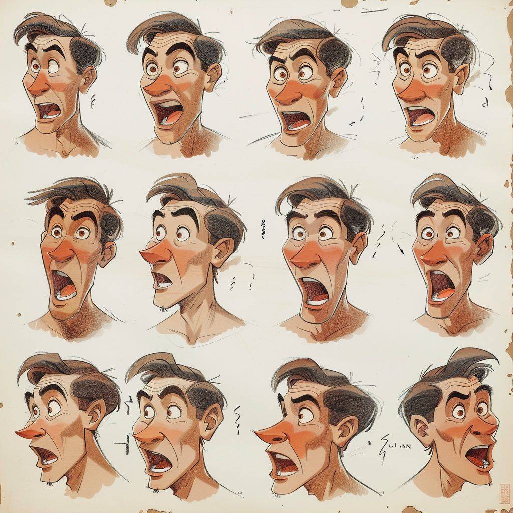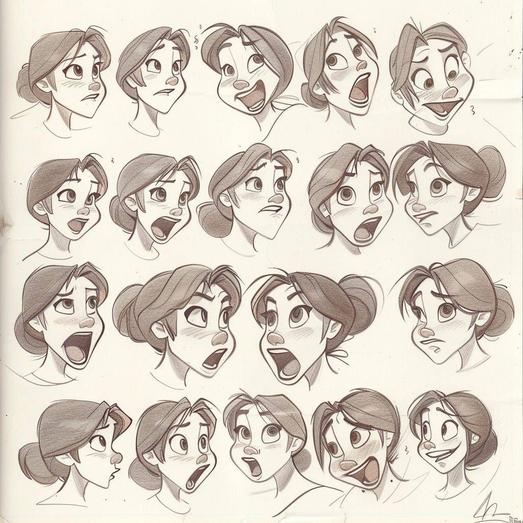 A character sheet of different facial expressions for a vintage Disney animation, white background, cartoon, pencil sketch, concept art, [color(s)] color palette, character design sheet, character illustration sheet, concept drawing