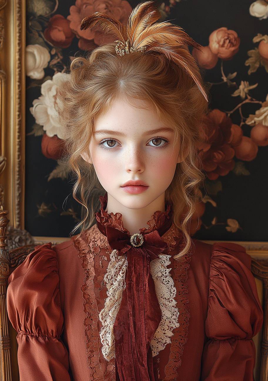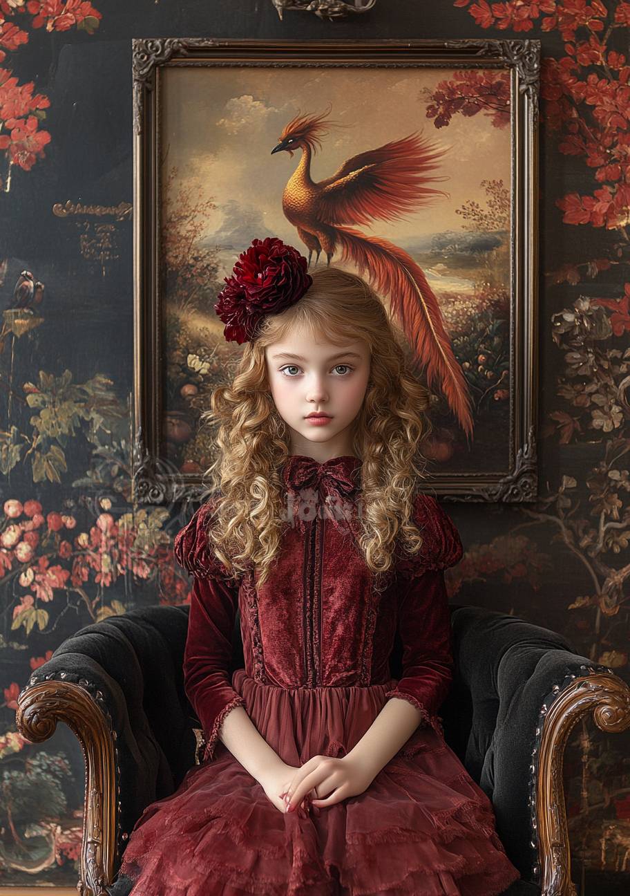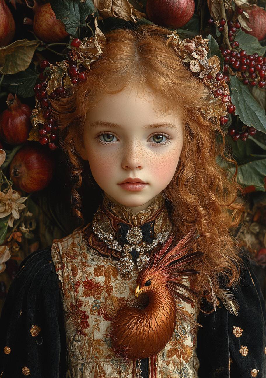 Photo pomegranate tree background, large framed painting Boucher Francois the Abduction of Europa background, 1732-1734, Scotland, stand furniture wooden and chair, stand side alien girl, Scottish girl, red curly hair, holding a golden phoenix bird, phoenix bird in Dumbo style, bird velvet feather and cartoon, SWAROVSKI crystal decorations, burgundy, gold, brown, black, realistic, film, kodak --ar 103:146 --stylize 1000 --v 6.1