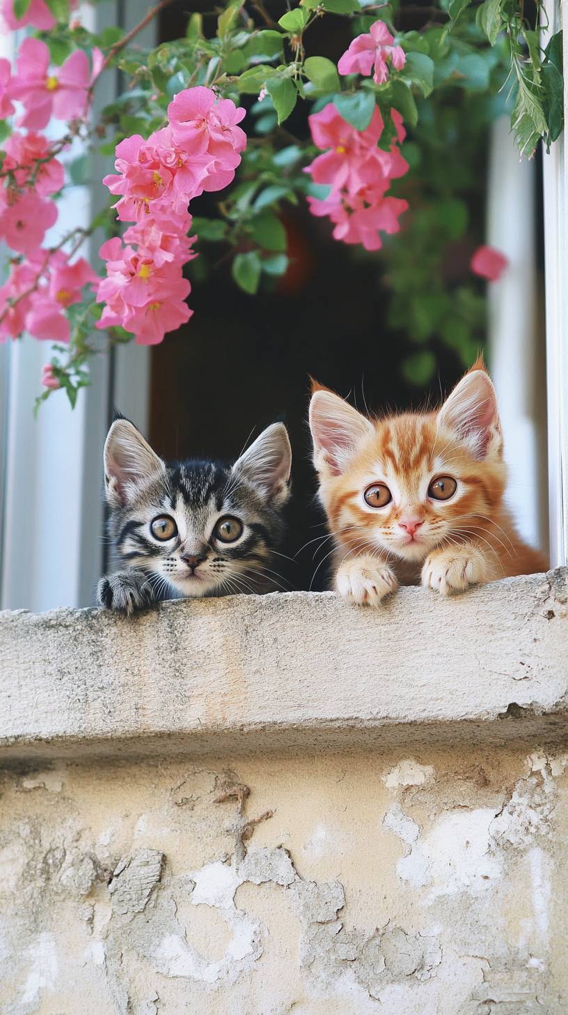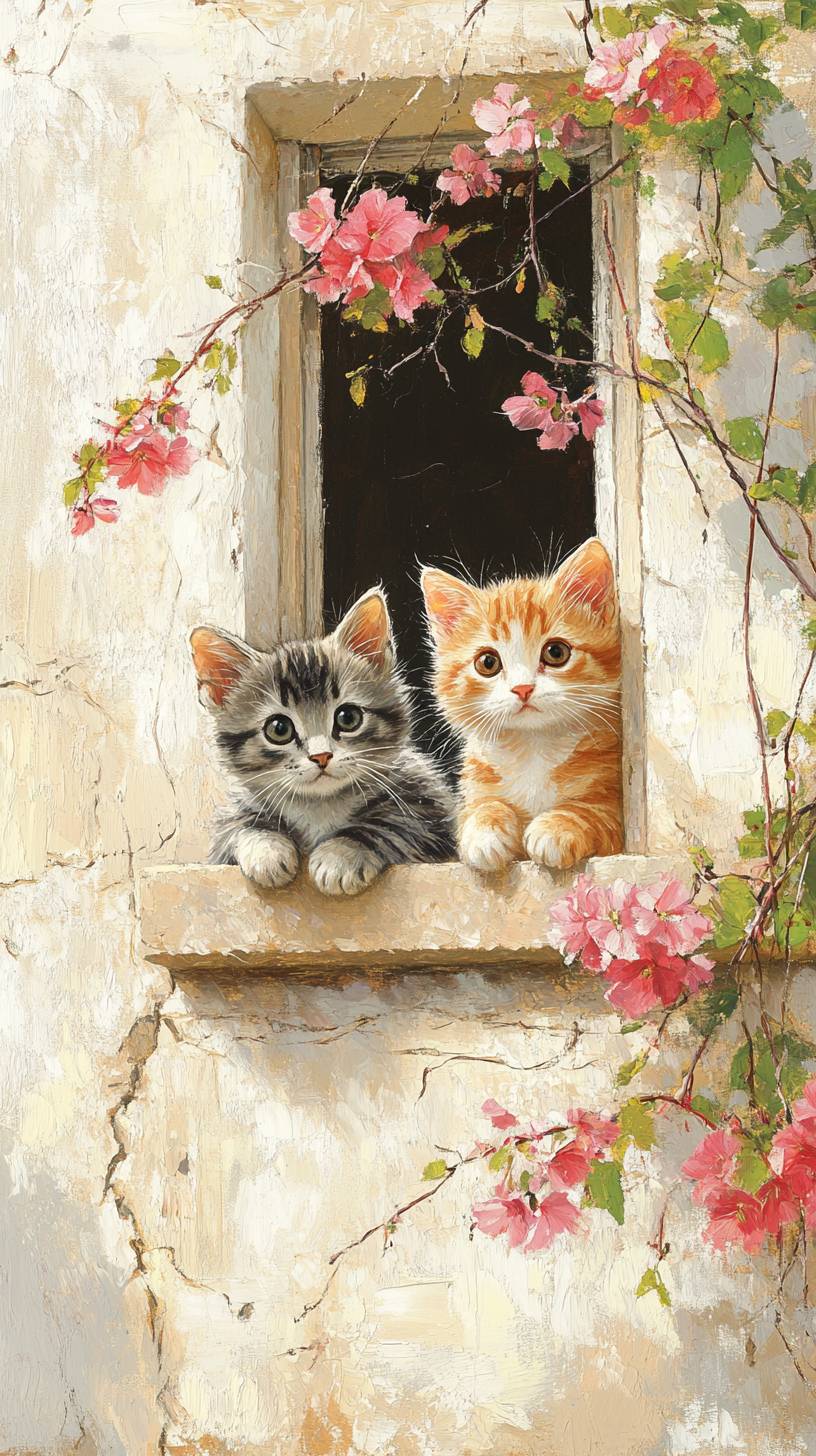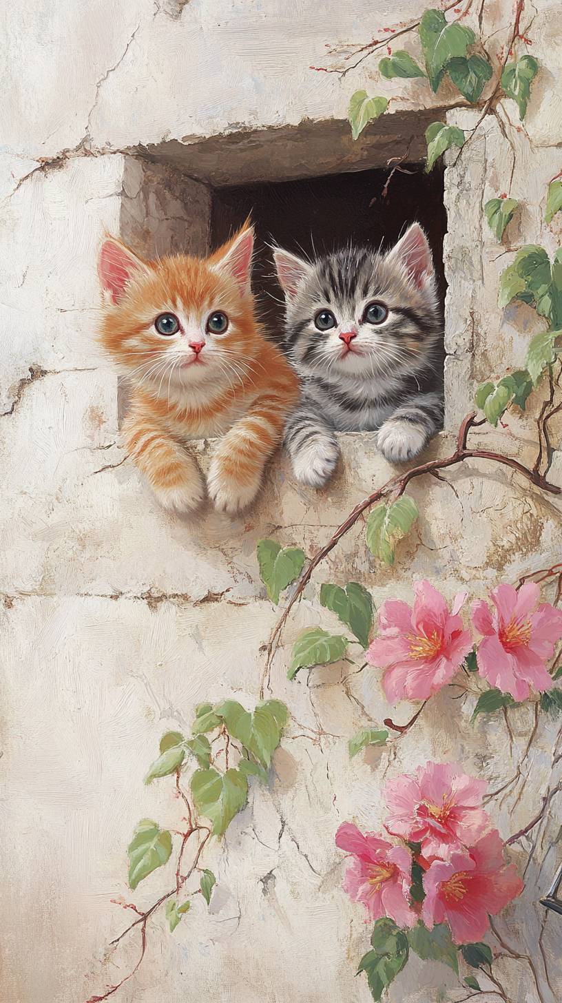 Cute cats peeking over the wall, in the style of a Japanese painting style, with pink flowers and green vines hanging from an open window, beige stone walls with white cracks in them, delicate brushstrokes, soft colors, and gentle lighting. The two kittens have different fur patterns on their heads and bodies, one gray cat with black stripes, another orange kitten with reddish fur, both facing forward towards the viewer. --ar 9:16 --v 6.1