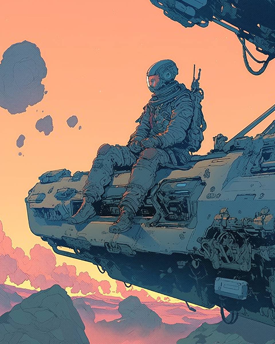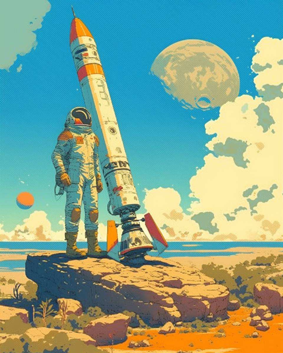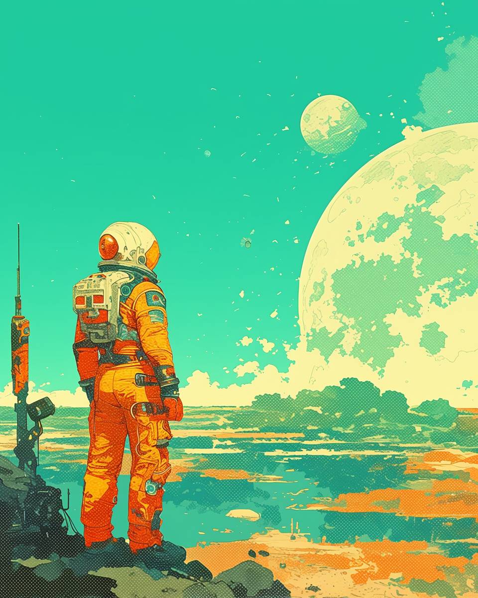 Retro-futuristic space explorer, vibrant high quality comic book style, alien landscapes, quirky spacecraft designs, bold outlines,halftone pattern backgrounds, high quality vintage sci-fi poster aesthetic, distinct line. --no low quality --ar 4:5 --stylize 500 --niji 6