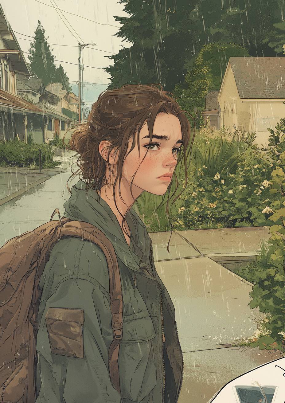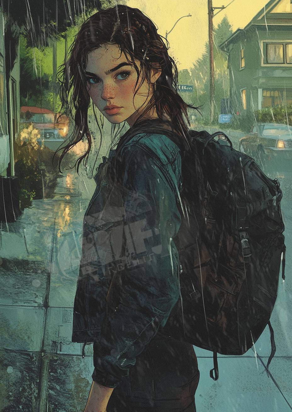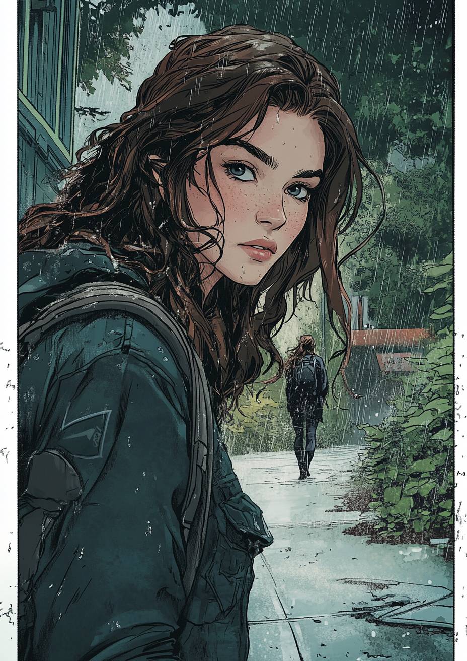 comic book panels; in color; young woman, brown hair, small backpack on sholder, walking down sidewalk seattle street in heavy rain, she looks annoyed --ar 83:117 --personalize updqkkn --stylize 200 --v 6.1