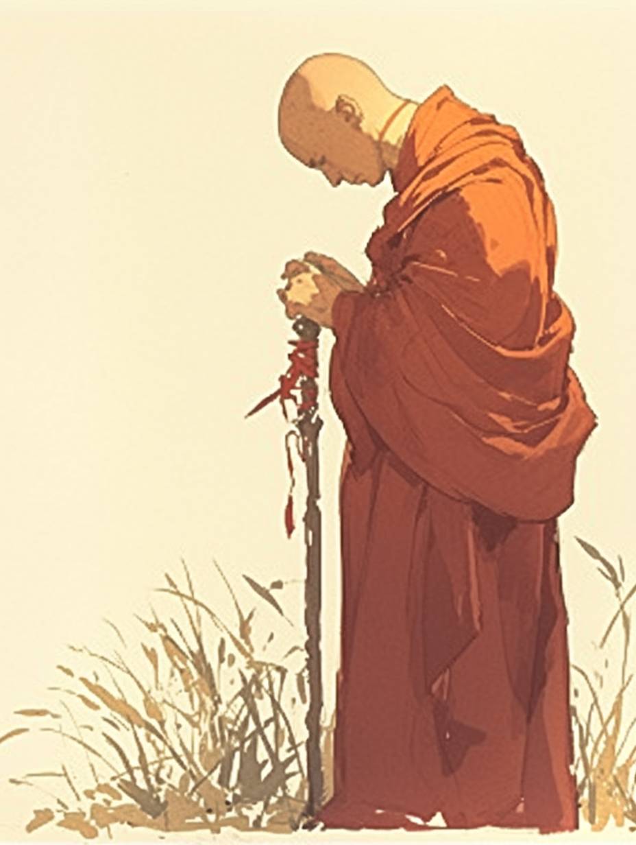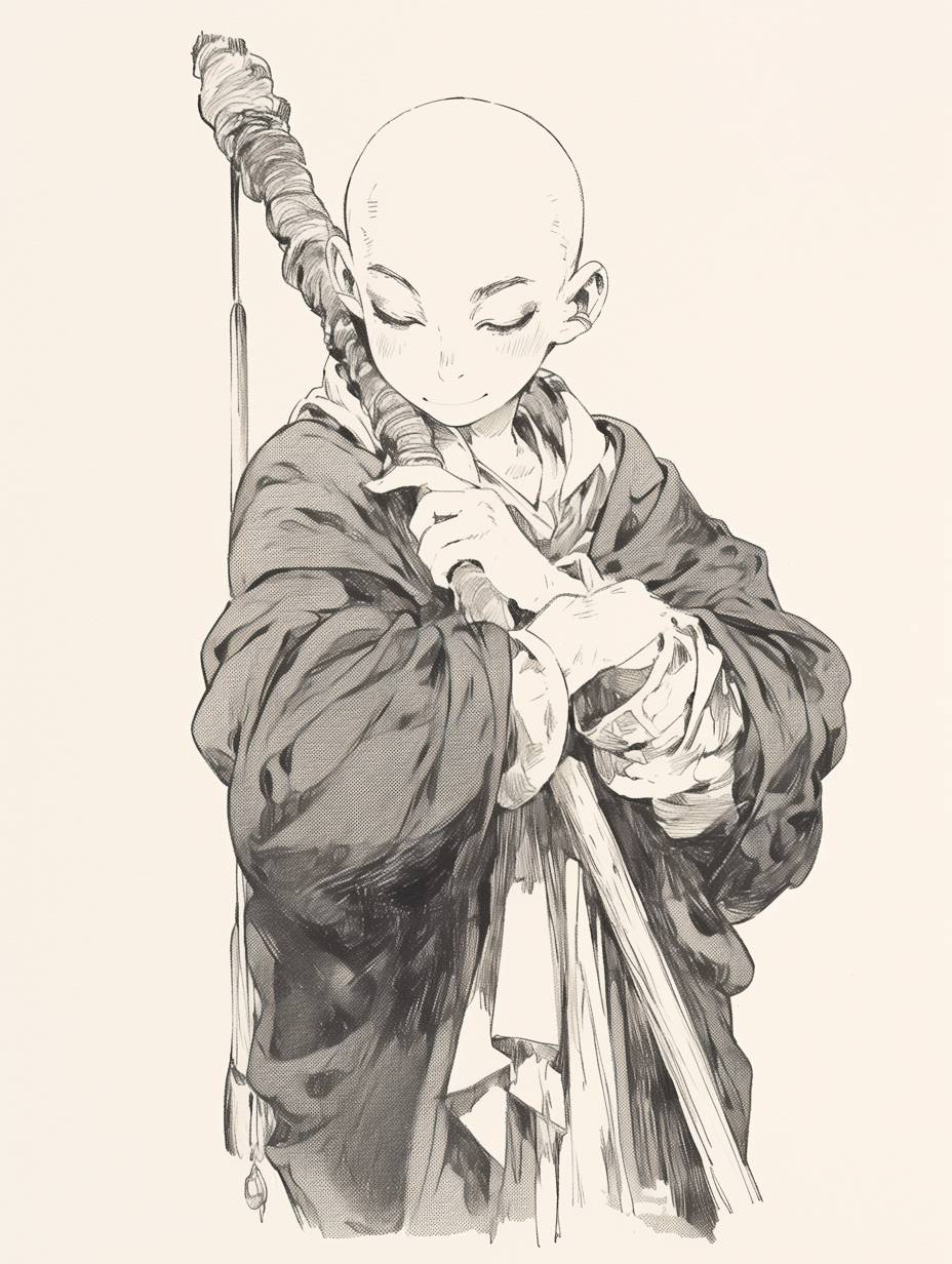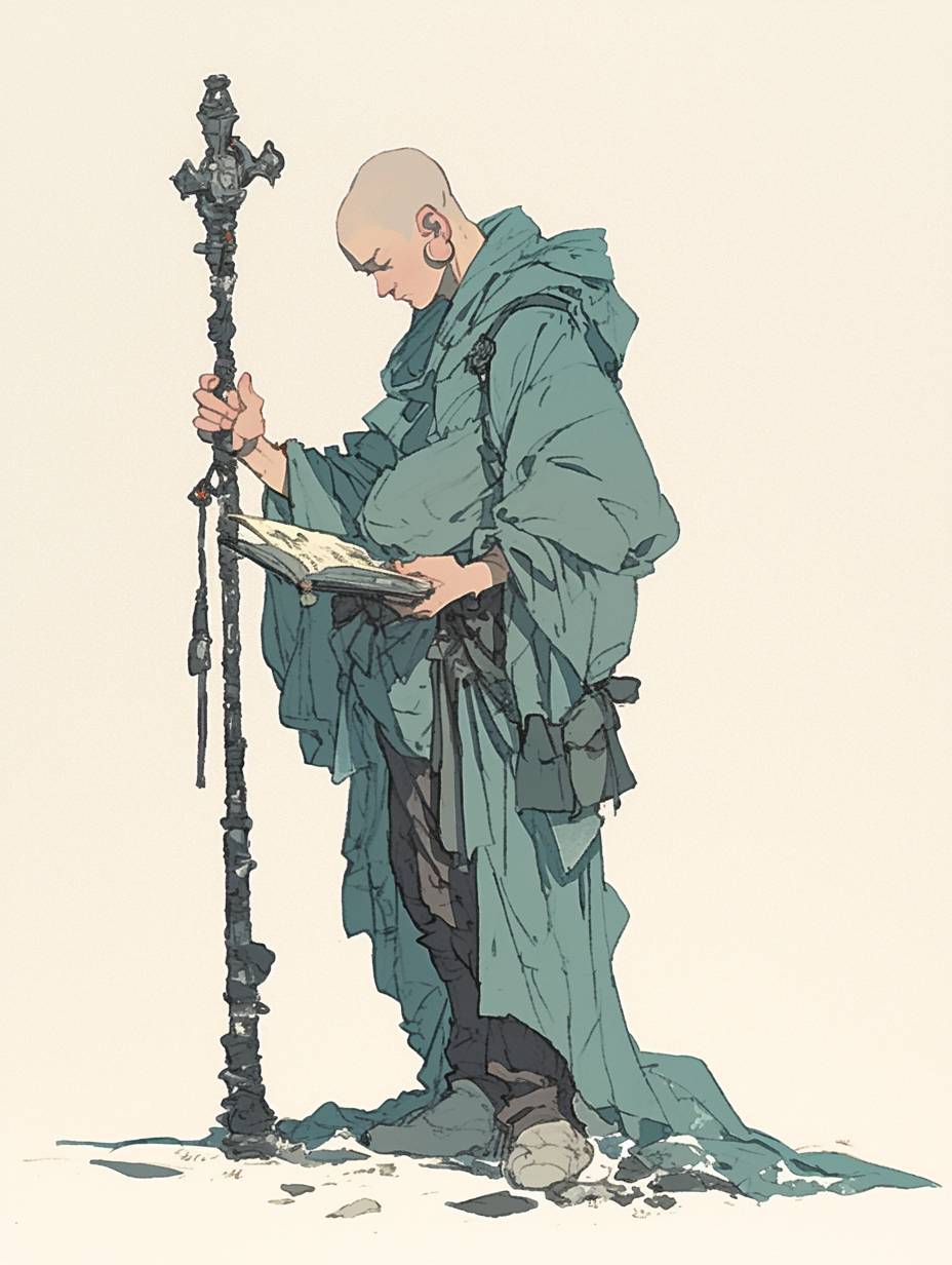 drawing of a young monk leaning standing against a staff with one hand whilst holding a book in the other hand. overall the monk has a very relaxed pose. he is focused on reading his book. drawing against a white background. --ar 3:4 --stylize 750 --niji 6