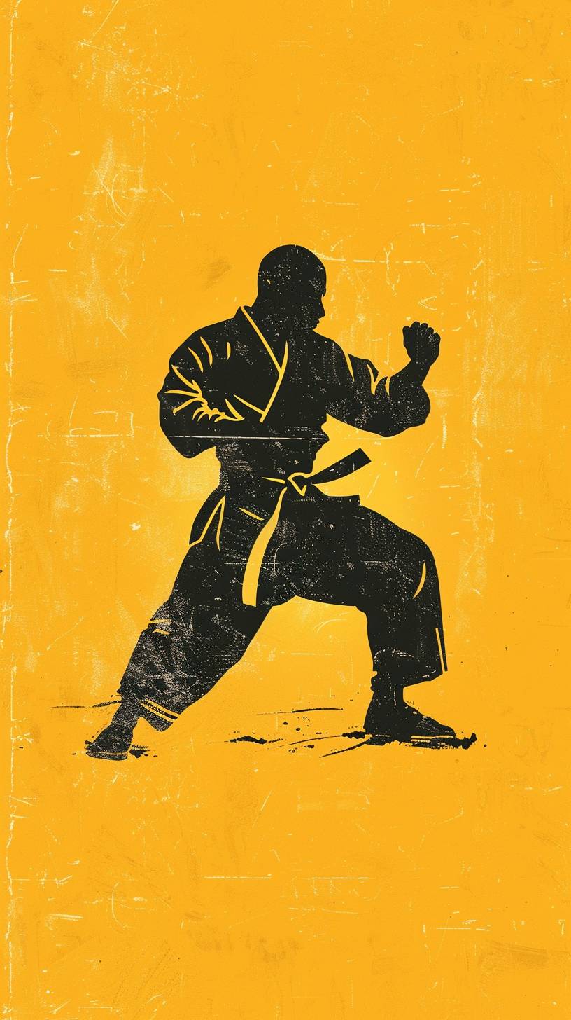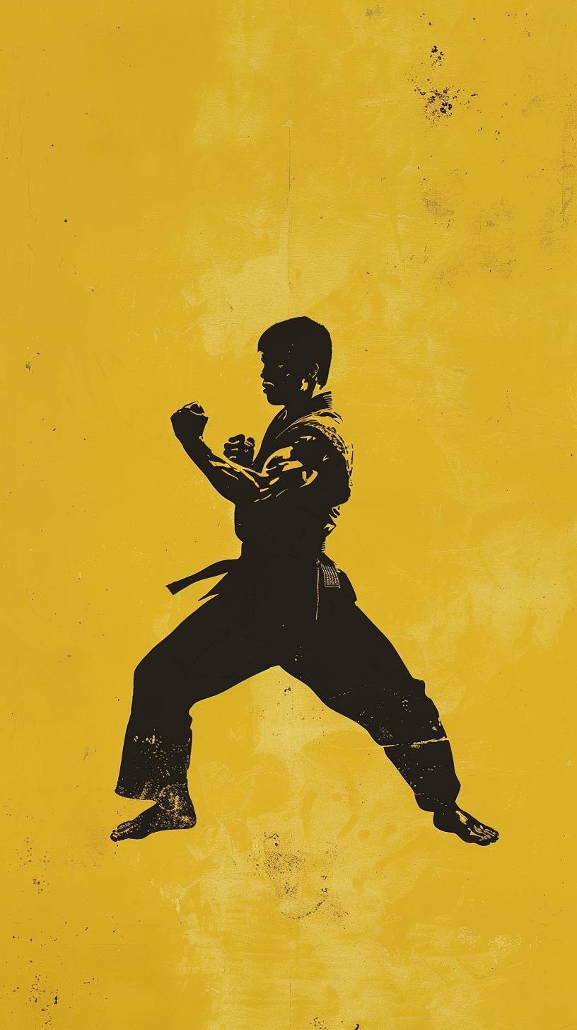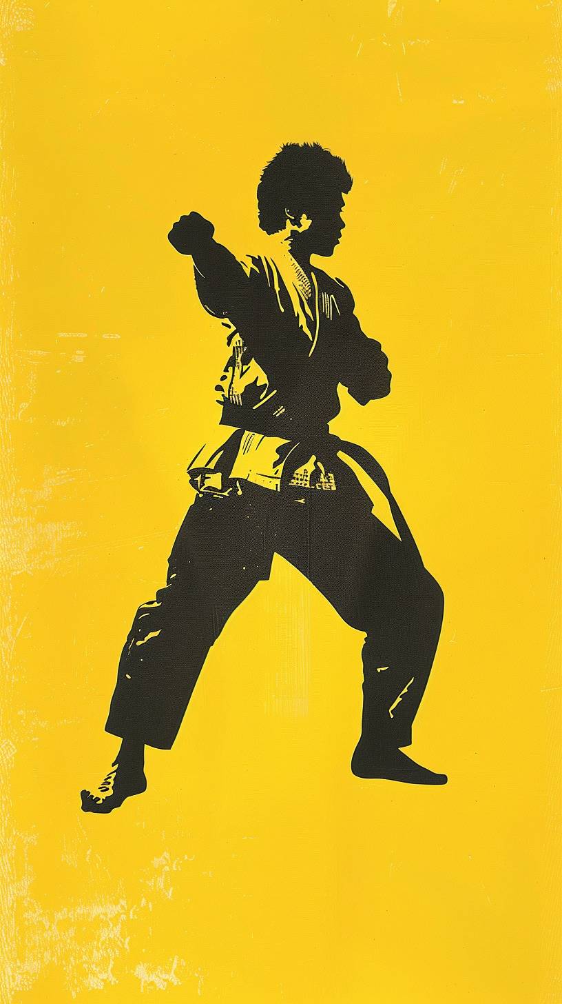 At its center, the silhouette of a 1970s-era Black martial artist is set against a solid yellow background.