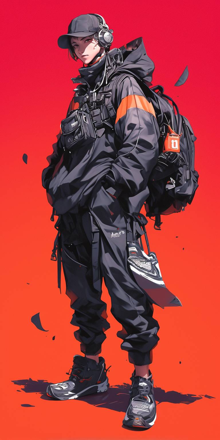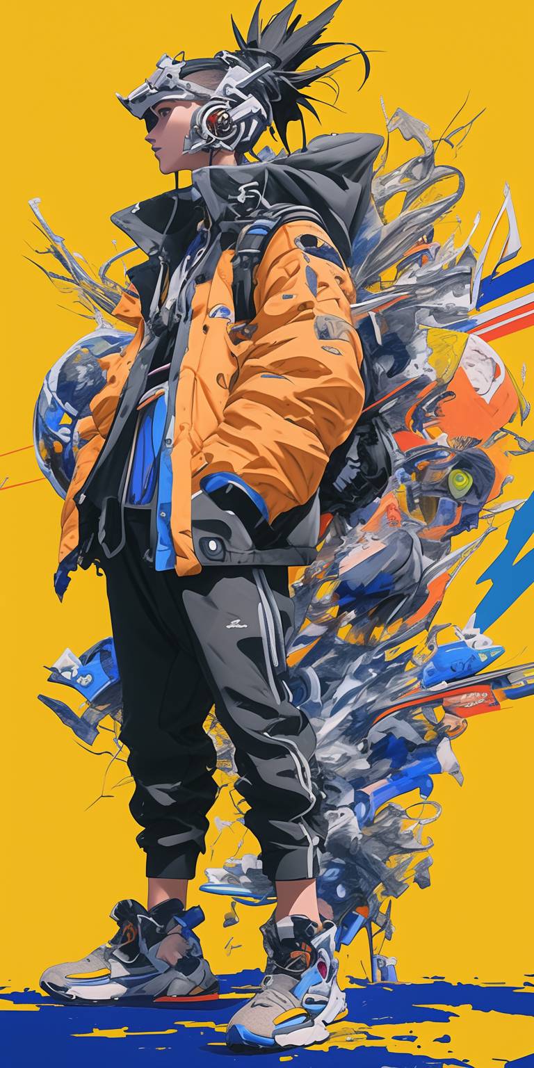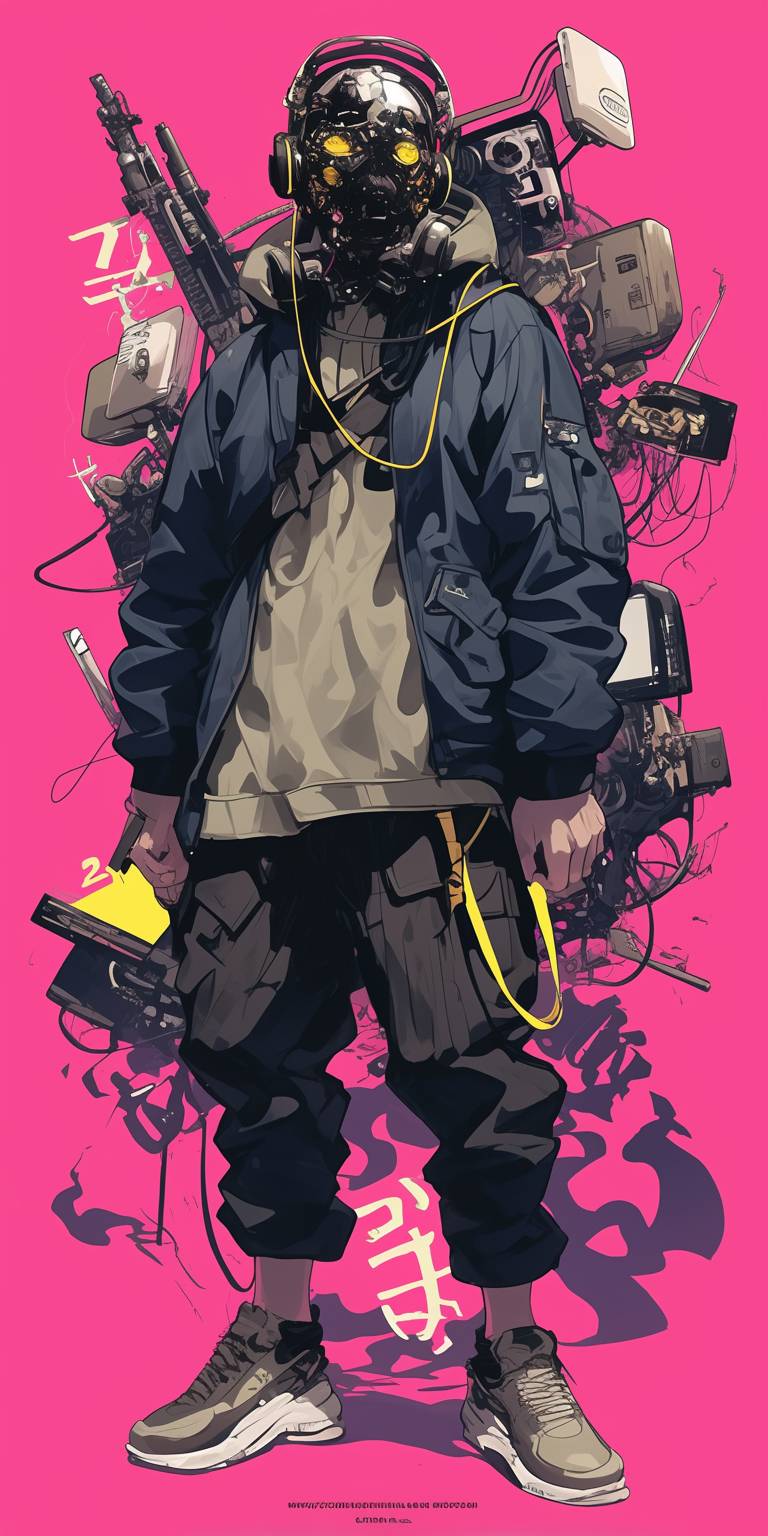 A Japanese anime-style character poster with autumn colors, cyberpunk style, full body portrait, wearing headphones on his head, dark gray shoes, cybernetic eye mask, stylish jacket, graffiti art elements, high contrast lighting, digital illustration, vector graphic design in the style of graffiti art. --ar 1:2 --stylize 750 --niji 6