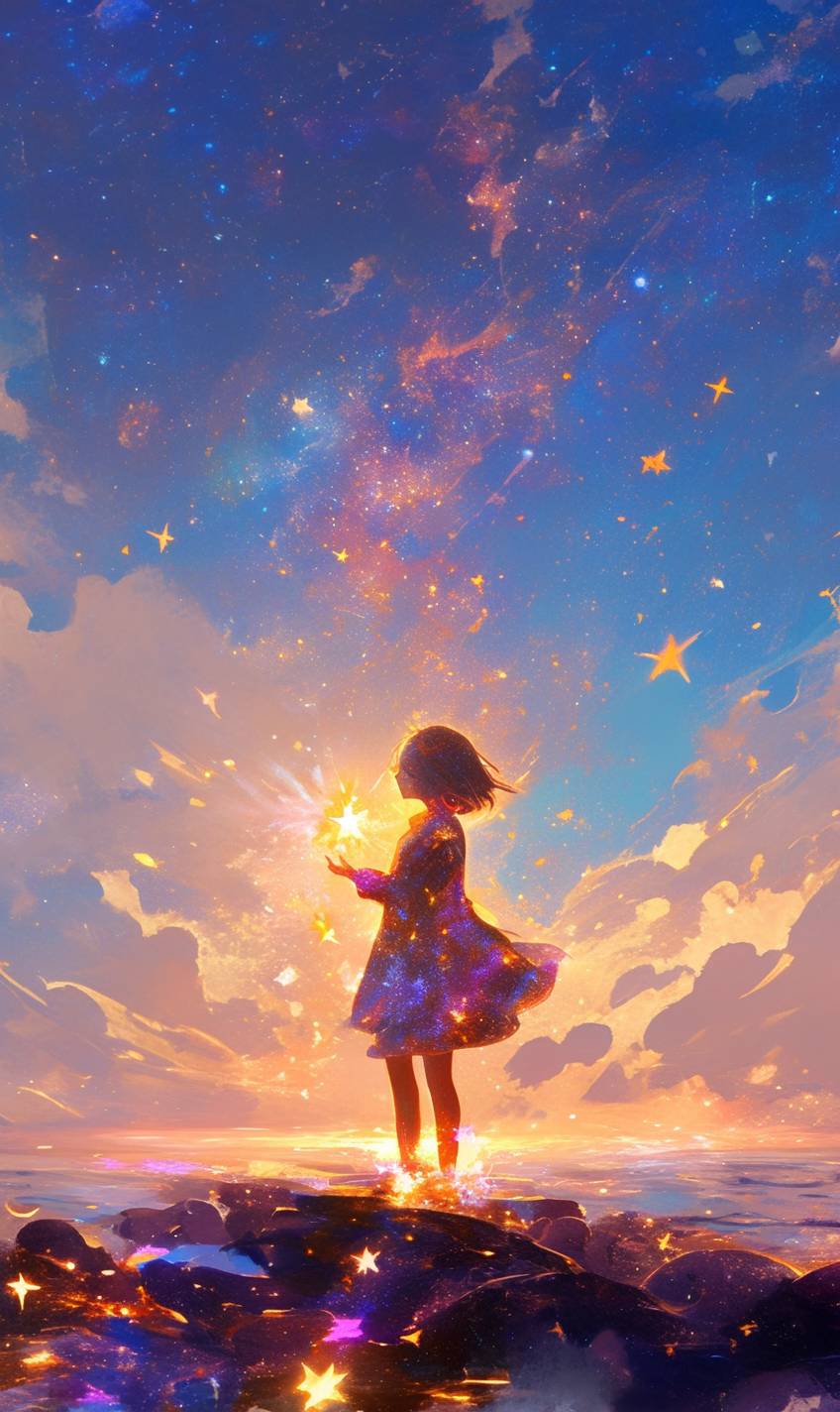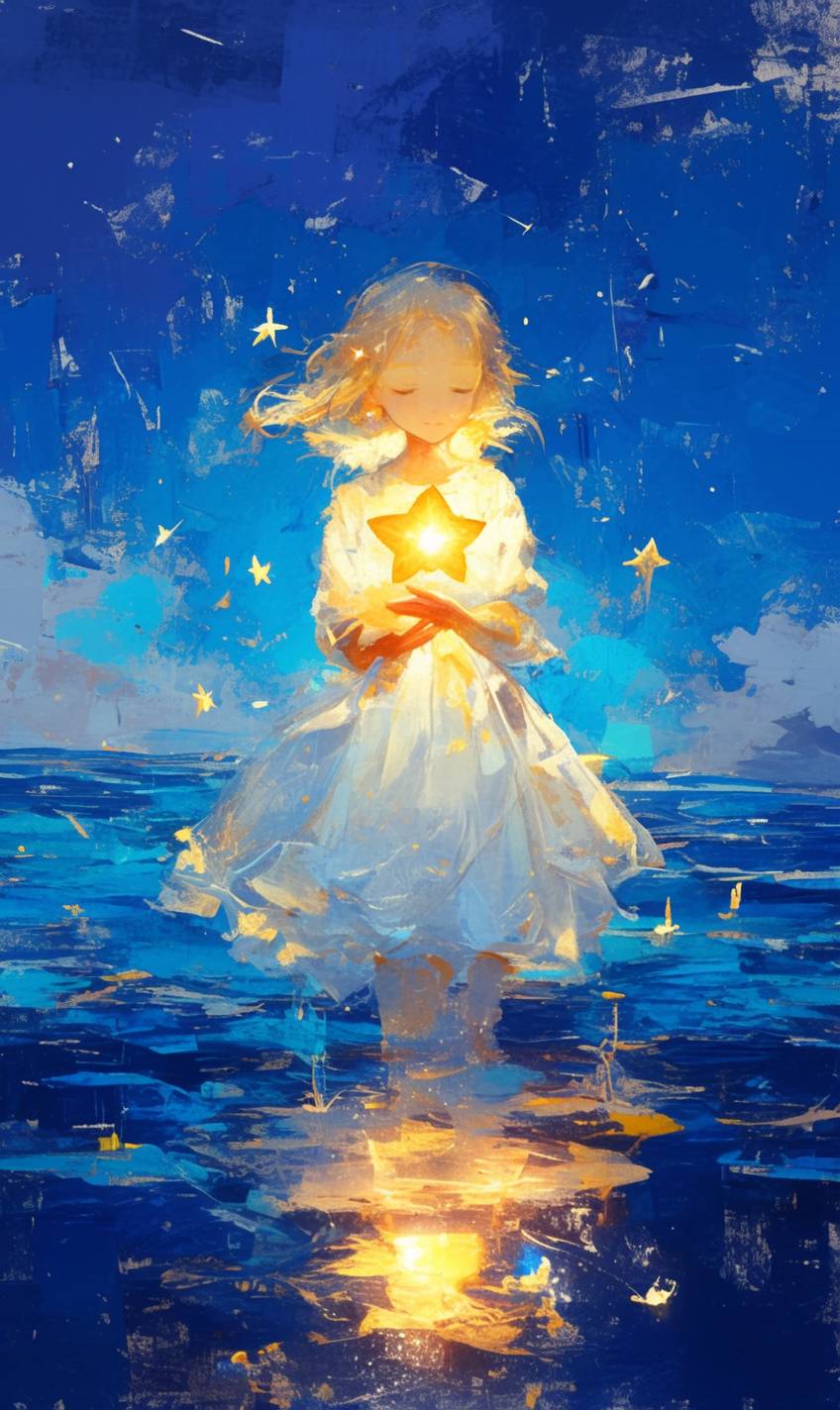 An anime little girl holds a shining star in her hands, surrounded by many little colored stars, standing on the sea and making a wish. Land of dreams, shooting stars, the Milky Way, colorful star clusters, headshot close-up, oil painting style, very obvious oil painting strokes, impressionist palette style, 32k UHD, beautiful, booru, old time, color cartoon.