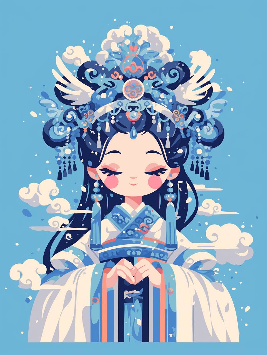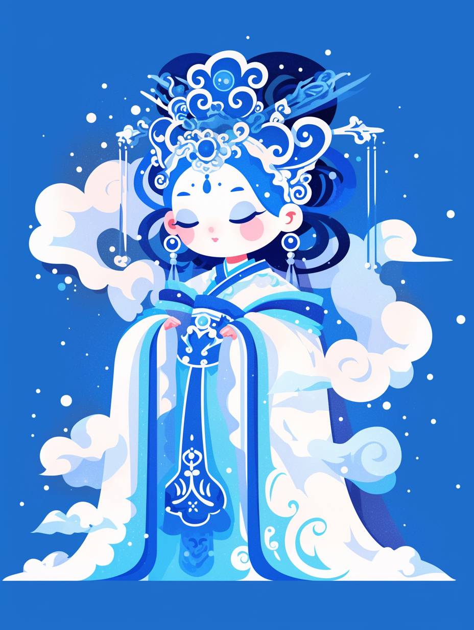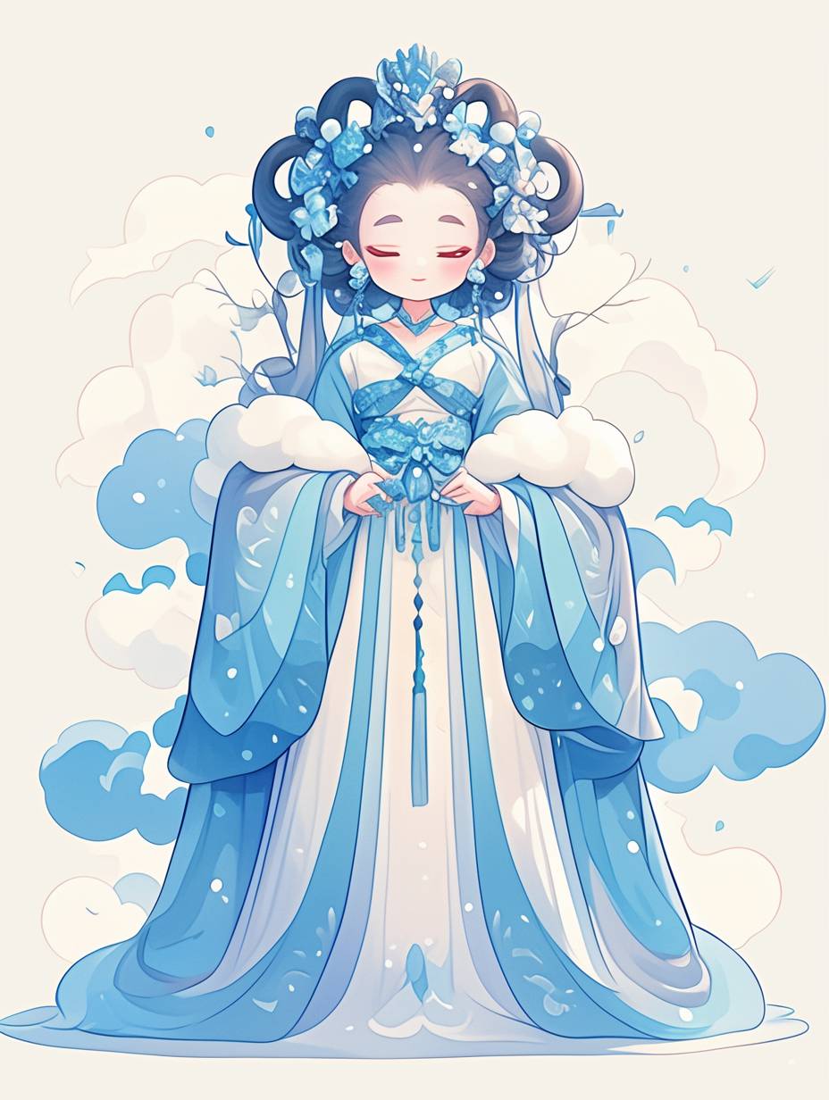 A cute ancient-style princess in blue and white porcelain-inspired , chibi character design, with curly hair, wearing an exquisite headdress, vector illustration style, full-body portrait, cartoon, simple lines, flat color blocks, simple background, auspicious clouds flowing around her, creating an atmosphere of dreamy mistiness, in the style of traditional Chinese art. --ar 3:4 --niji 6