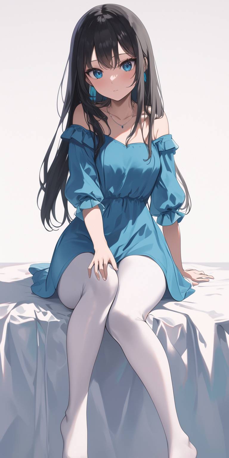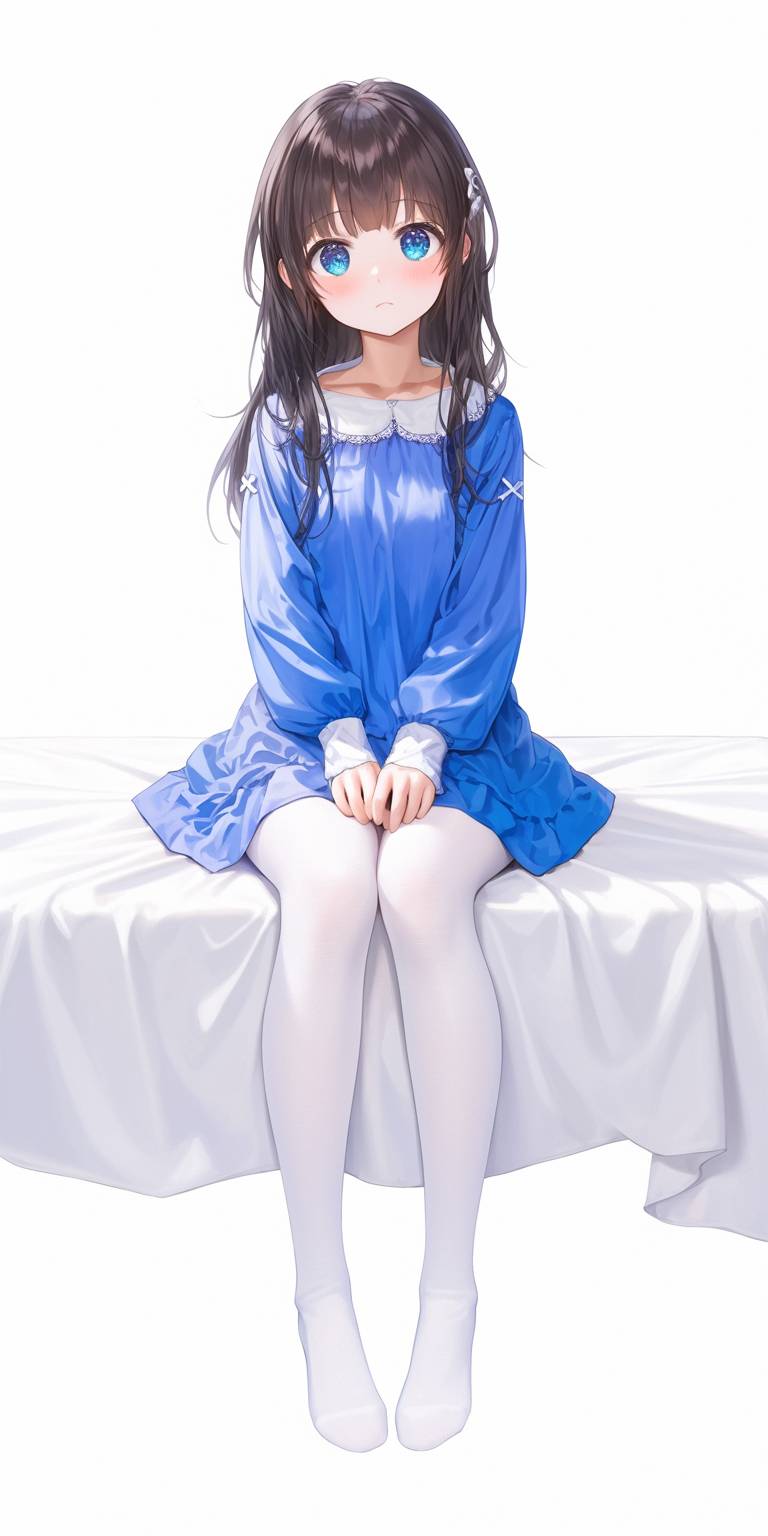 Anime girl sitting on the edge of a bed, wearing a blue dress and white tights, with long black hair and bangs, blue eyes, simple background, full-body portrait, white tablecloth under her feet, in the anime style, with a cute expression, high resolution.