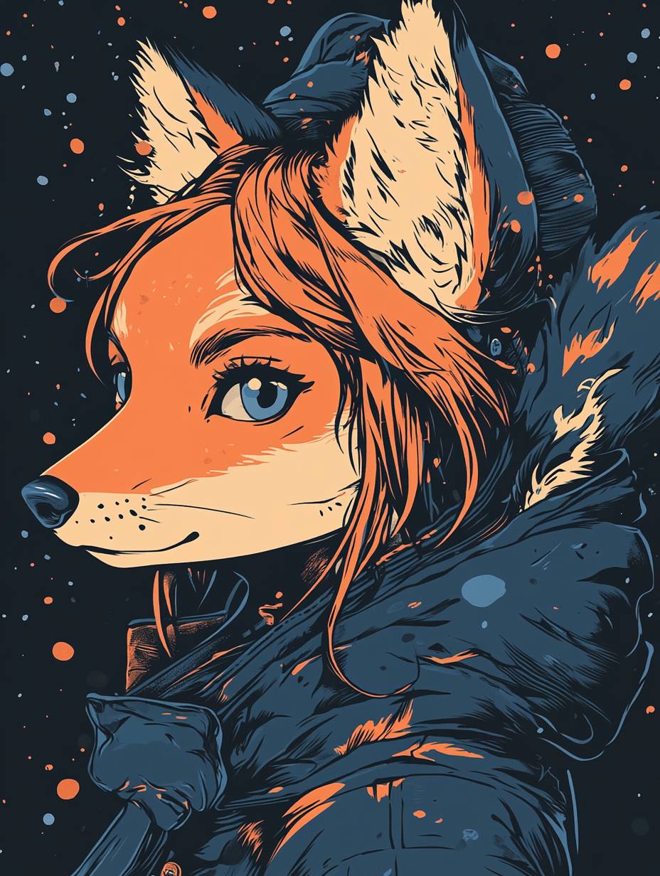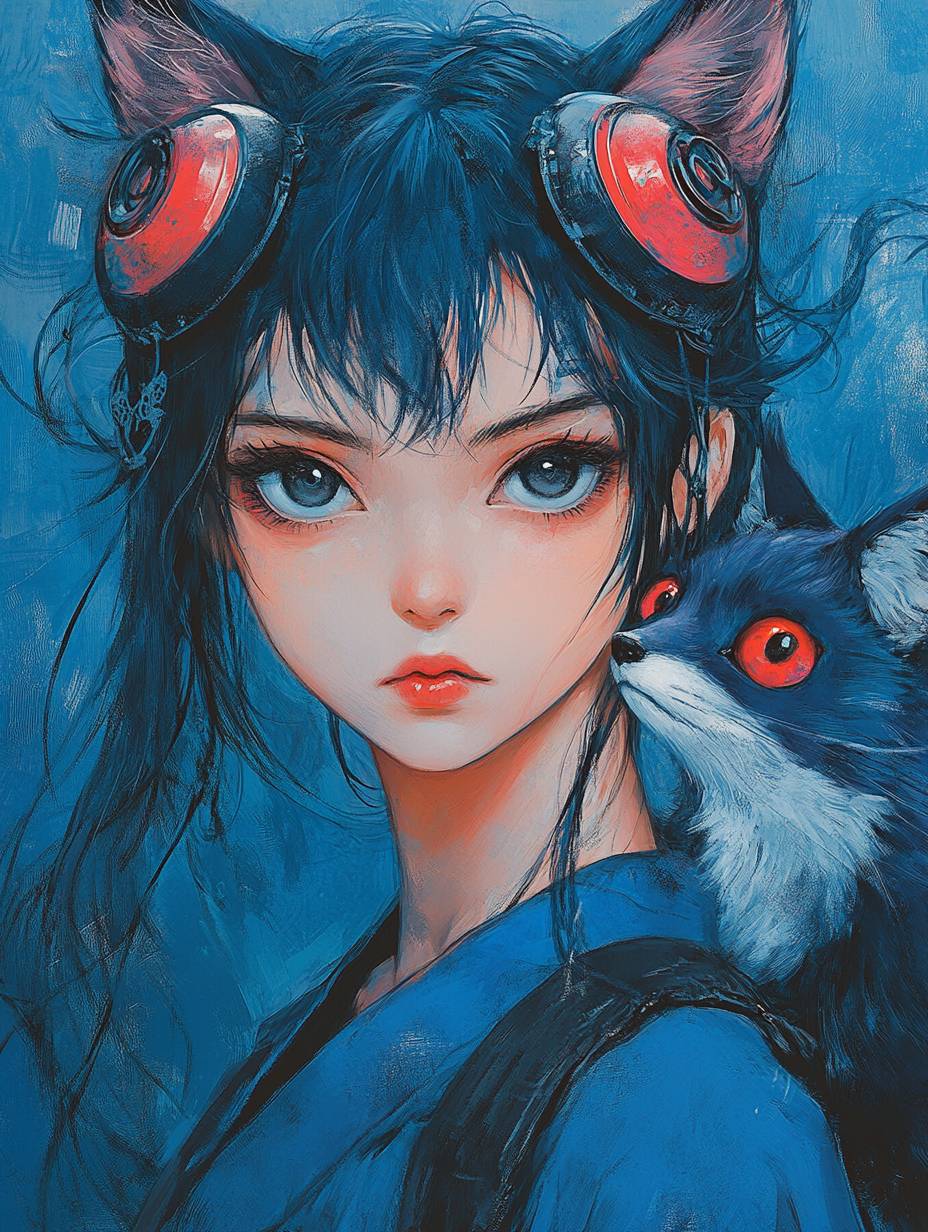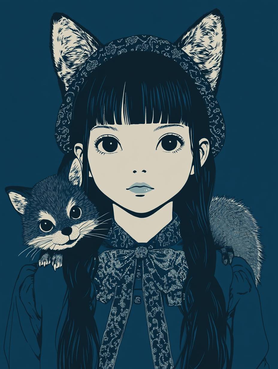 anime Girl with fox monster on shoulder,in the style of crisp neo-pop illustrations,fashion art,simple illustration,miwa komatsu,psychedelic,dark blue --ar 3:4 --stylize 250 --v 6.1