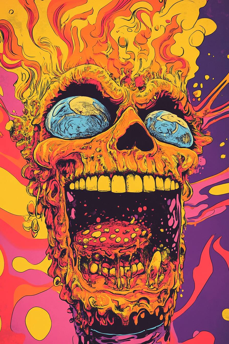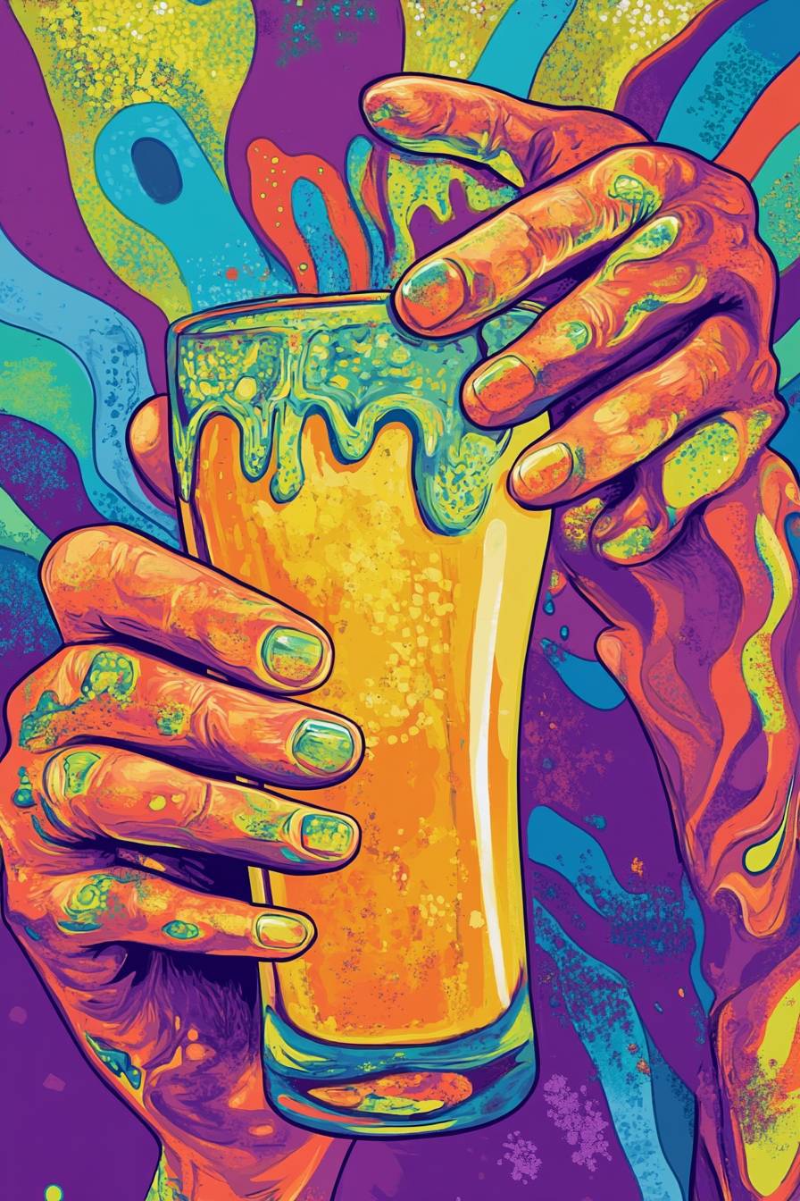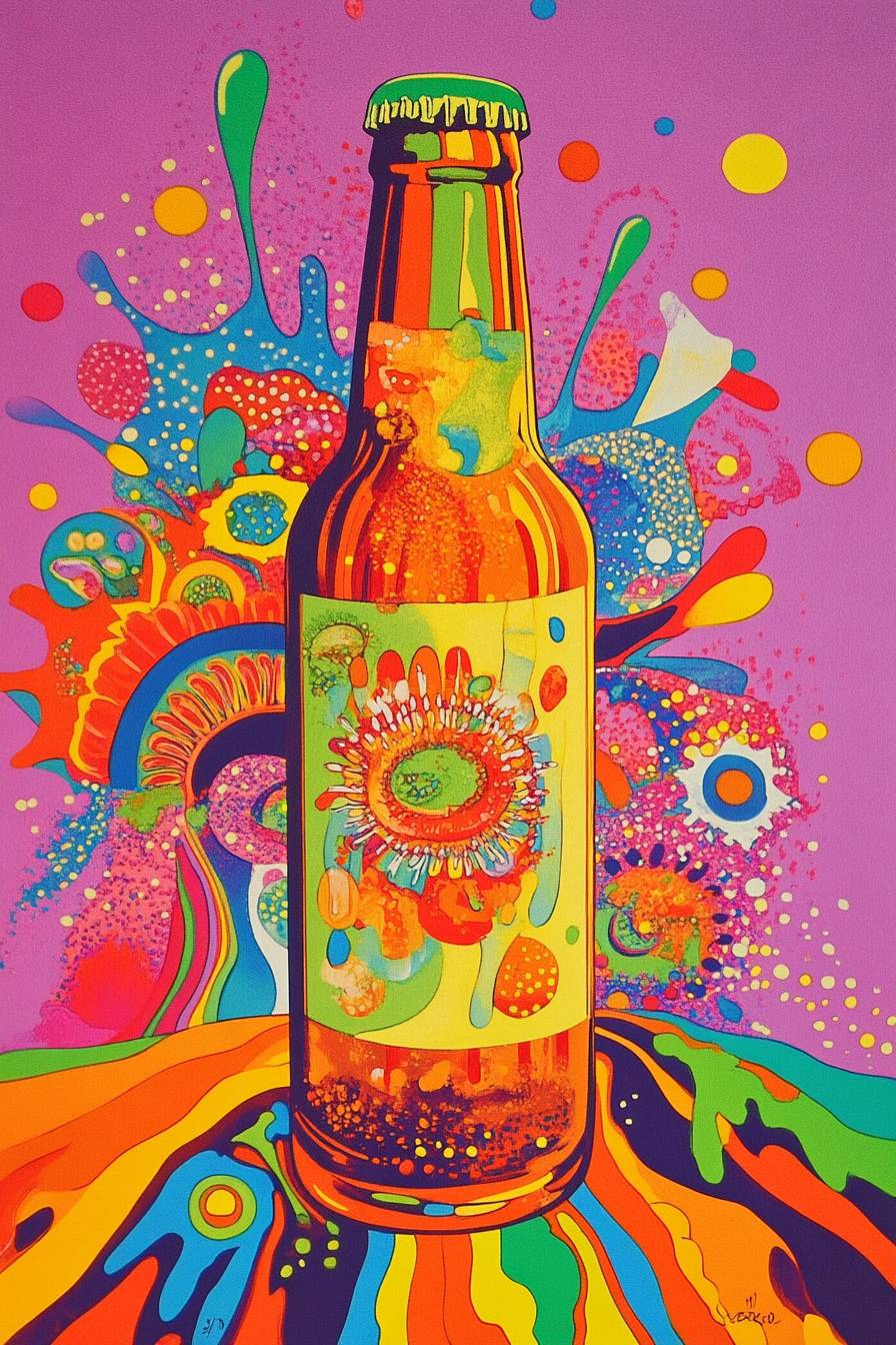 Pôster de cerveja colorido no estilo da arte psicodélica dos anos 70