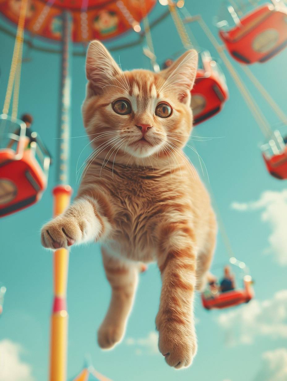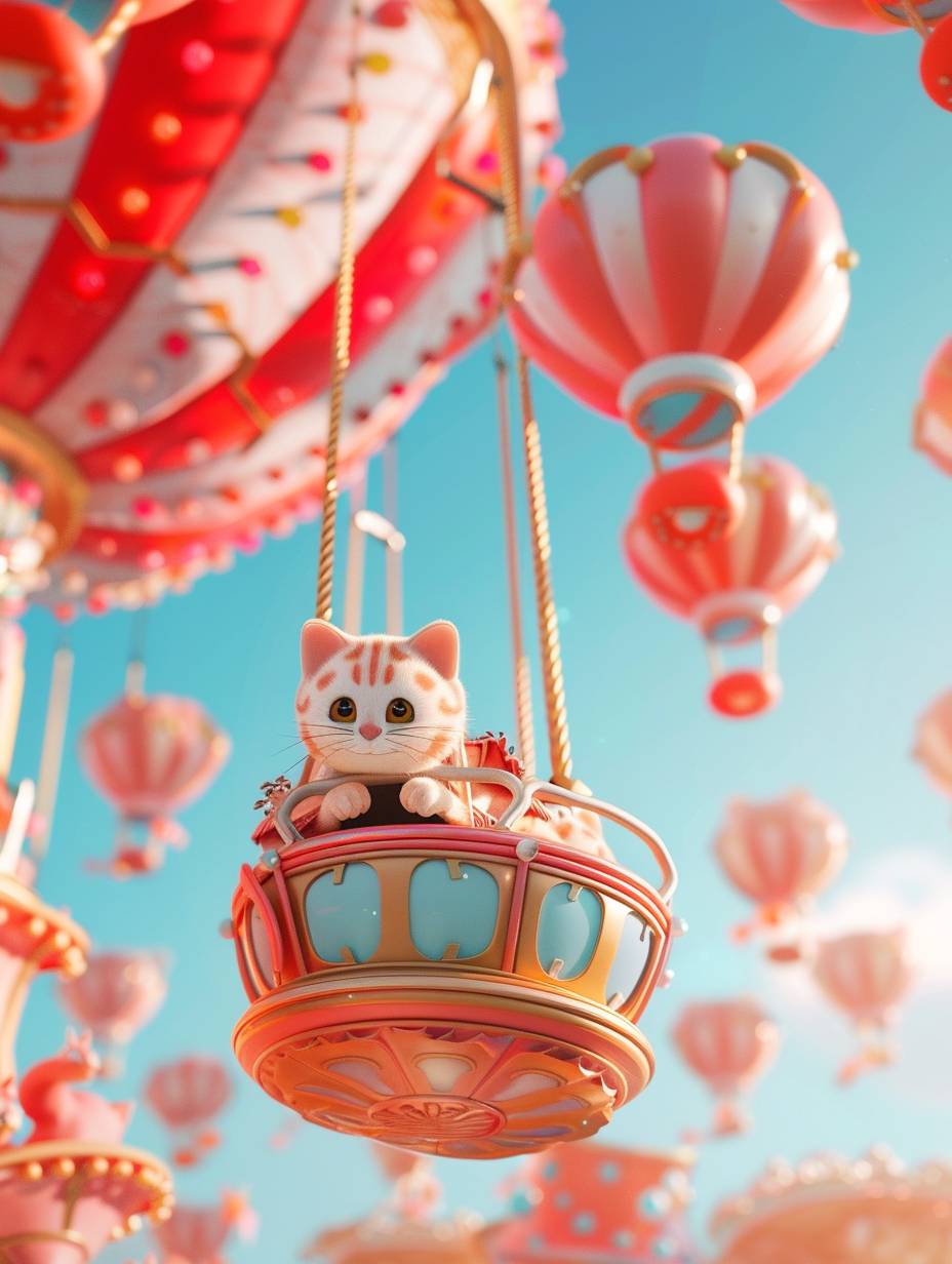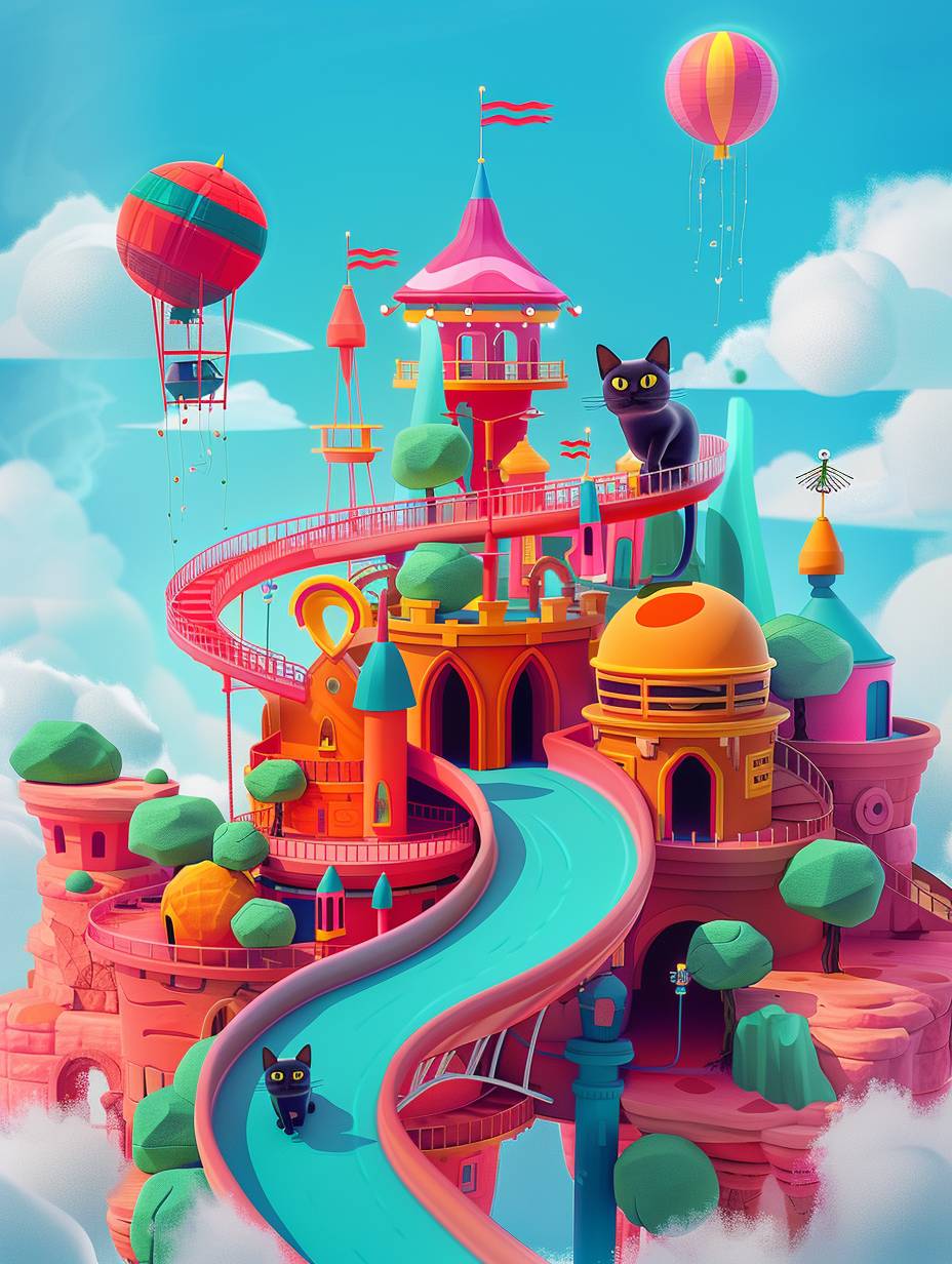 O conceito de design inclui gatos, parques de diversões flutuantes, minimalismo ao estilo Pixar, com fundo de cor sólida.