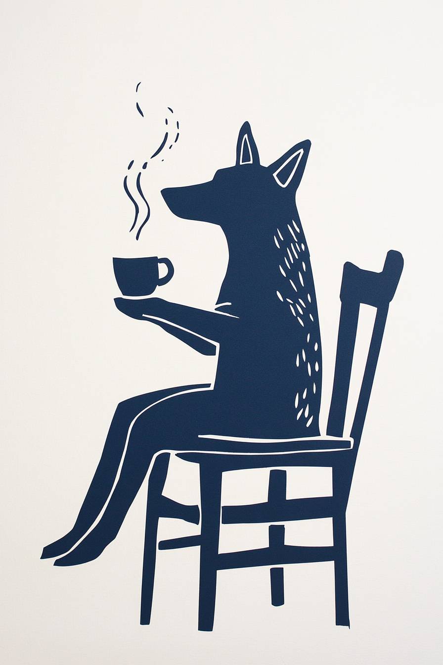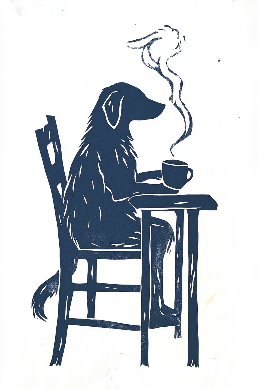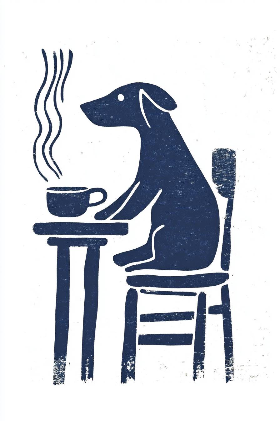 Uma ilustração simples em linoleogravura de um cachorro sentado em uma cadeira, segurando uma xícara com vapor saindo dela. A obra é feita em tinta azul marinha sobre um fundo branco, apresentando formas simples que parecem ser esculpidas à mão.