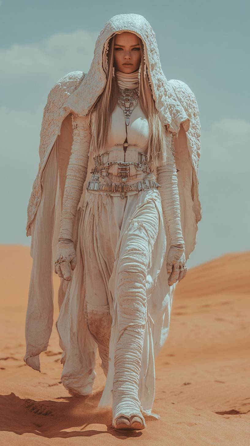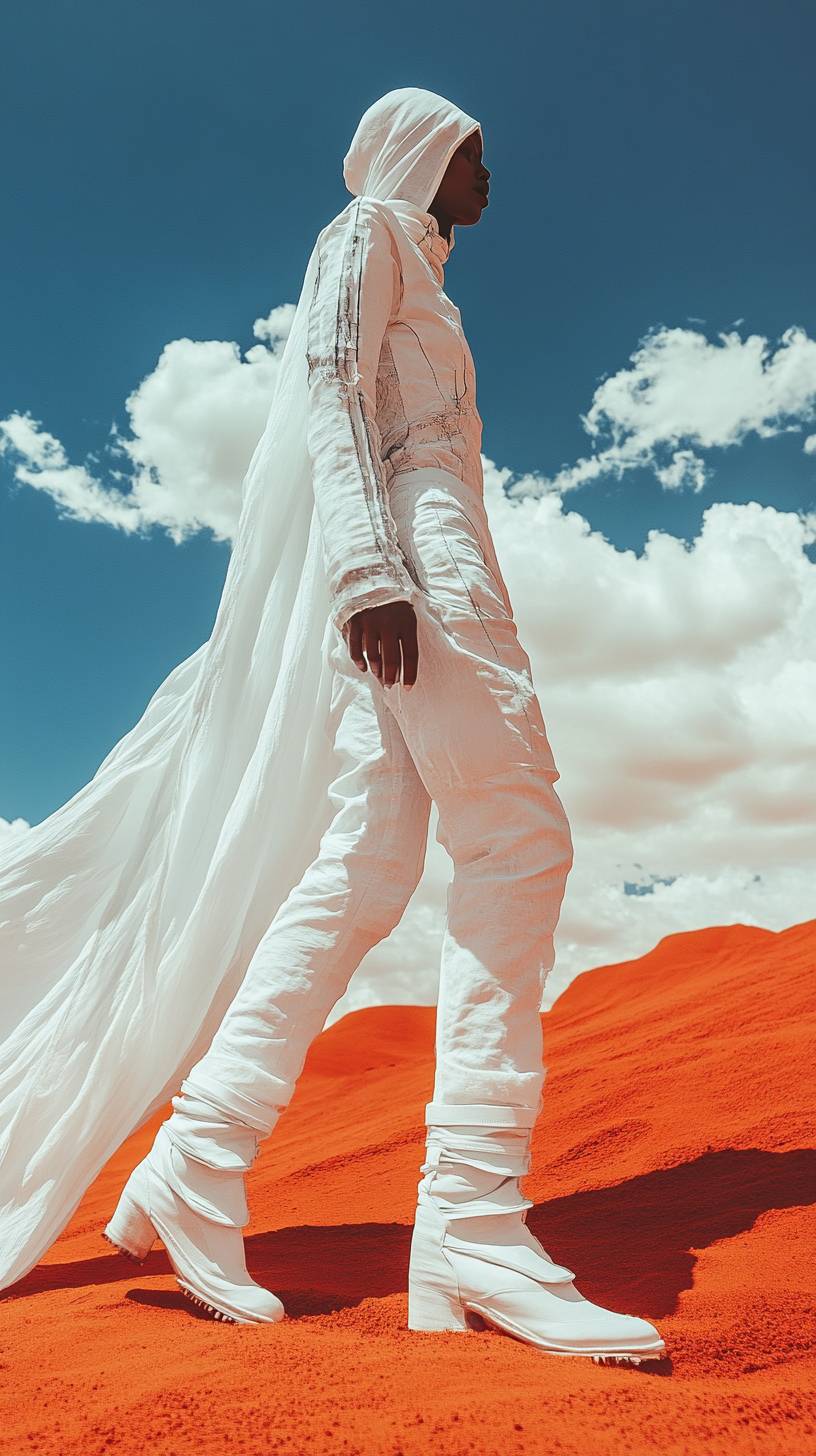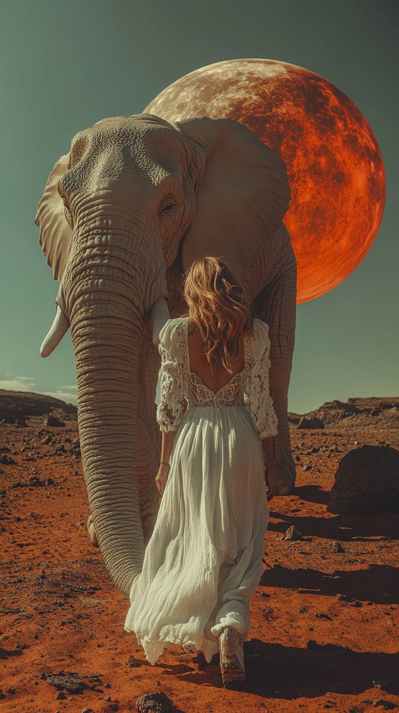 full body photograph of a futuristic interstellar dinosaur woman elephant in flowy white dystopian clothing walking through the red desert. cinematic. dynamic lighting. high detail. leica m11 --ar 9:16 --stylize 250 --v 6.1