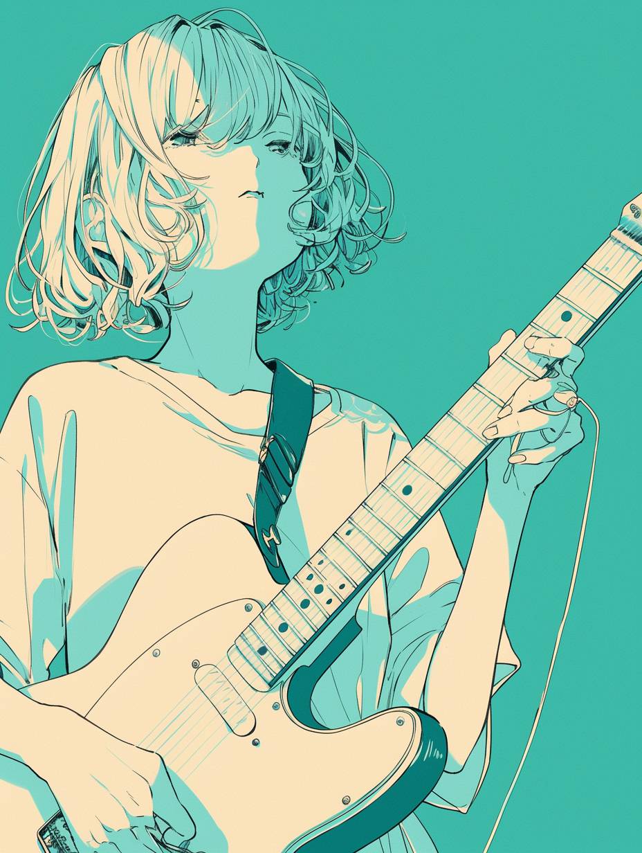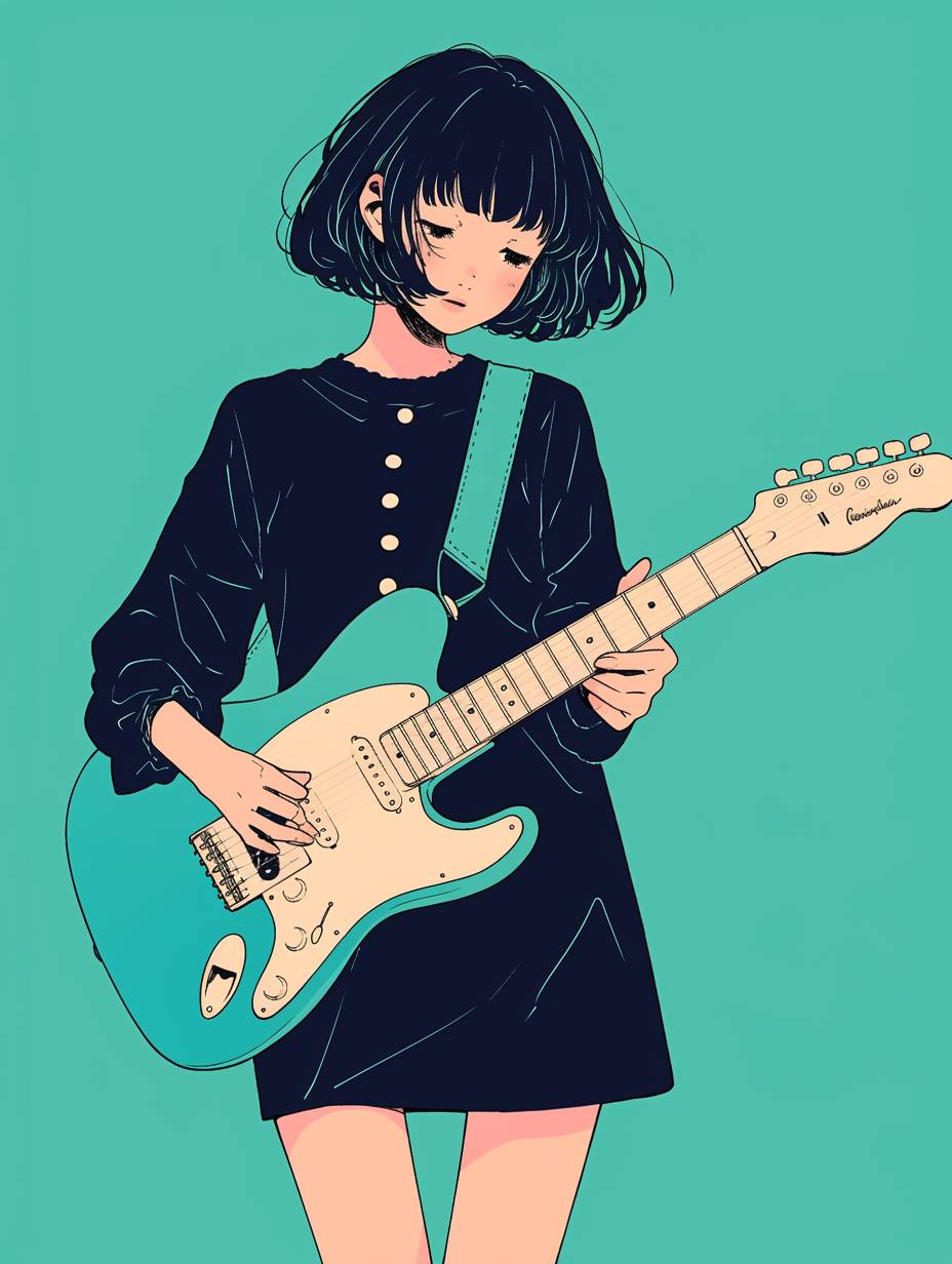 Minimal, a 17years old mint bob hair girl with bangs, she wear mint dress , she plays a teal color telecaster guitar, The Harvest Moon rises, muted teal green and lights background nostalgic mood, black and white, line drawings, Line sensitive art --ar 3:4 --niji 6