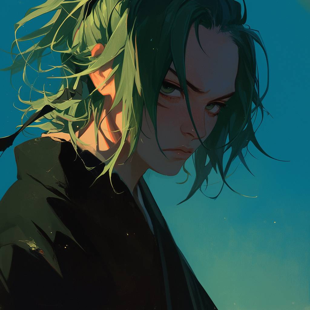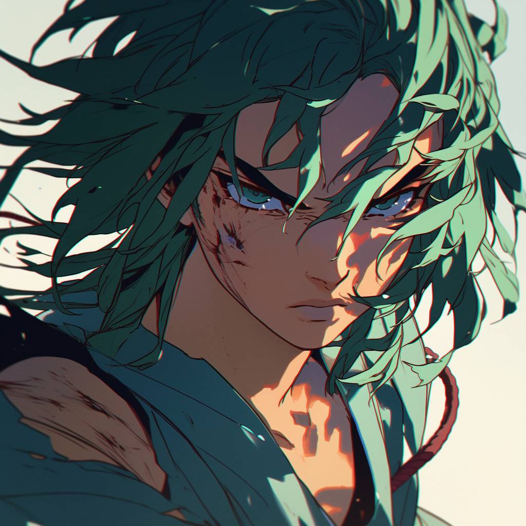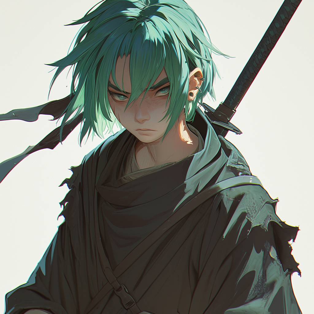Retrato de um jovem samurai com cabelo verde e roupas negras rasgadas