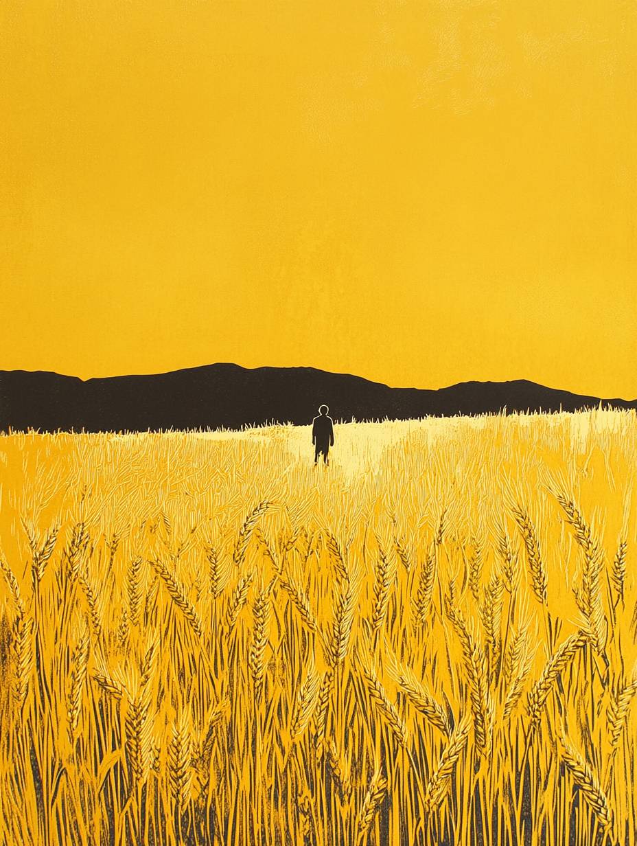 lino cut of In the golden wheat field, in the distance of the picture, there is a silhouette of an old Asian man walking in the field with his hands open,colorfu, fine art print, --chaos 12 --ar 3:4 --stylize 185 --v 6.1