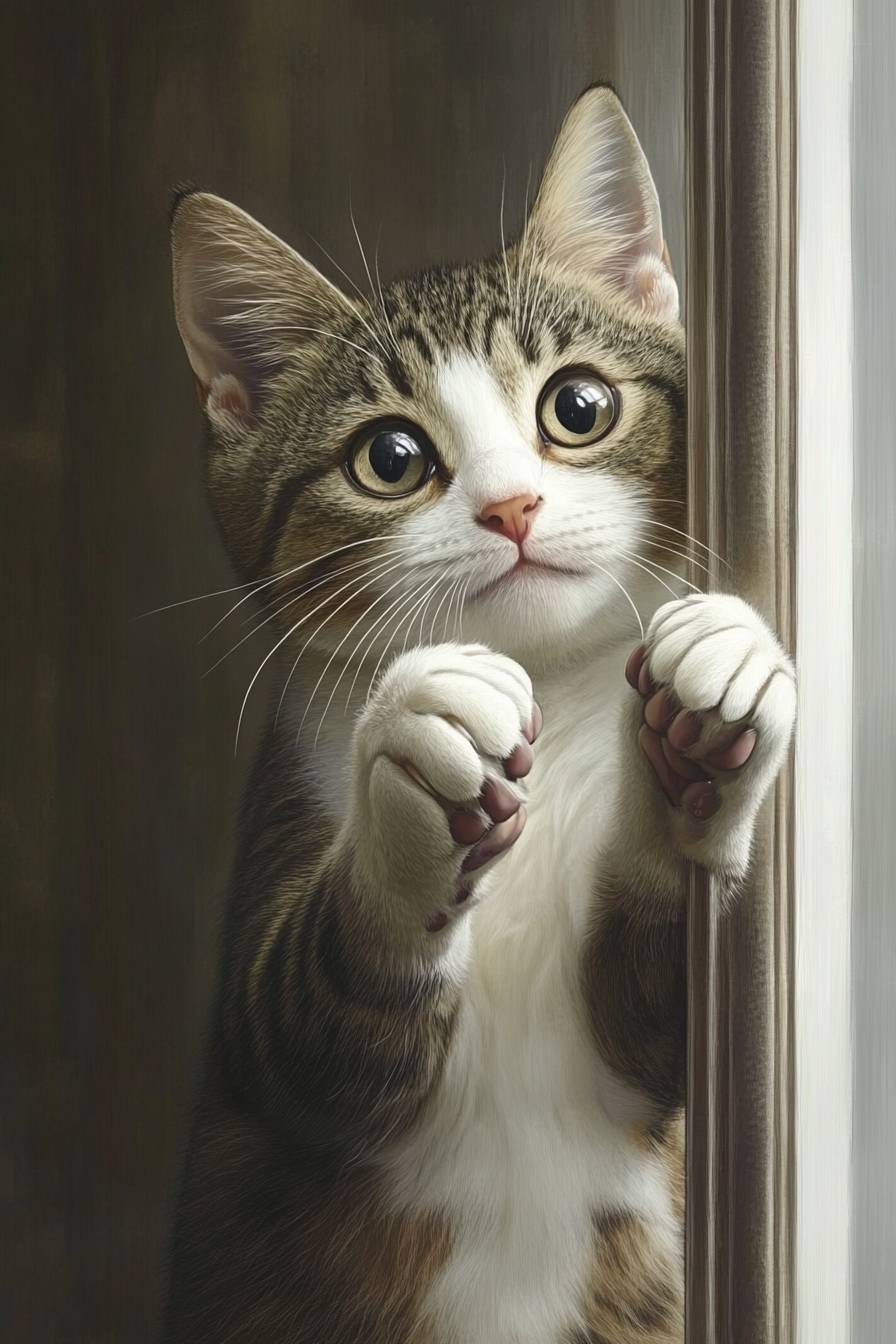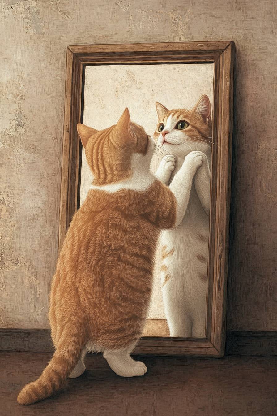 Um gato marrom e branco está de pé em frente a um espelho, olhando para seu próprio reflexo. O gato tem suas patas apoiadas no espelho, como se estivesse conversando consigo mesmo no espelho. O fundo é uma parede simples, e a atmosfera geral é humorística e tocante.