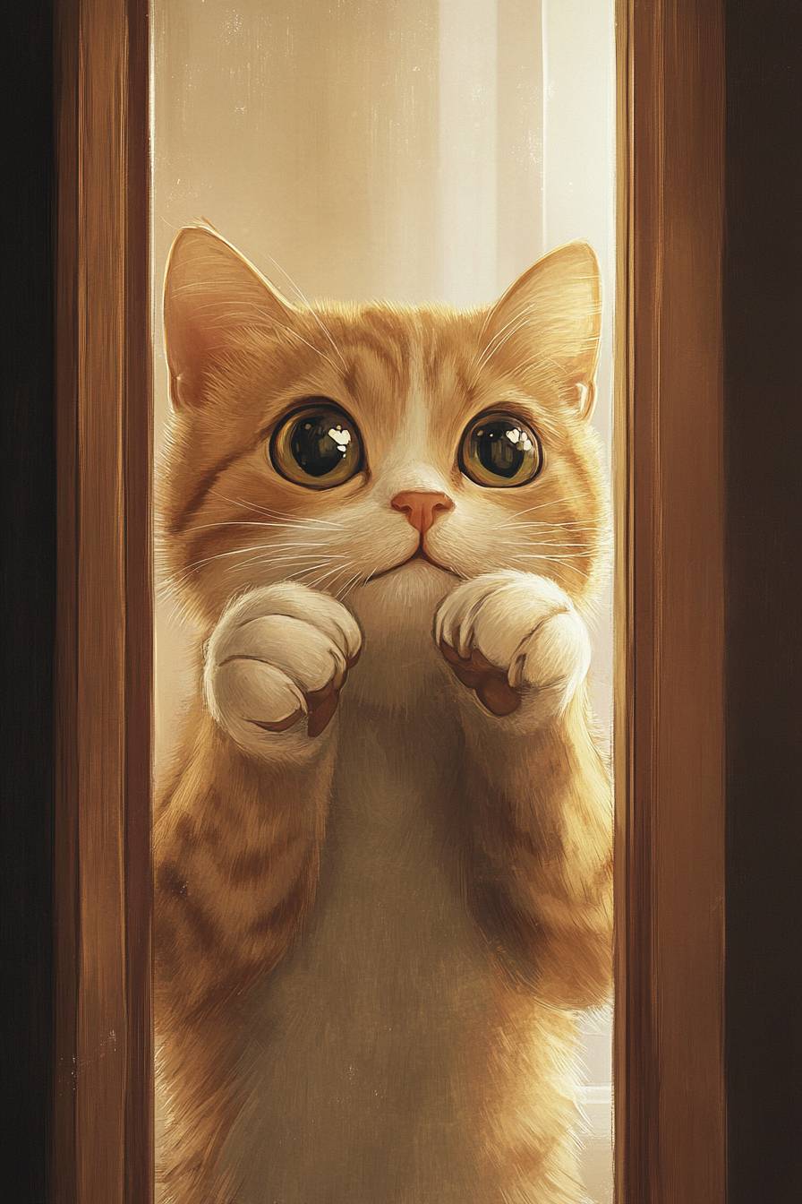 Cute illustration of a brown-and-white cat standing in front of a mirror and staring at its own reflection. The cat has its paws draped over the mirror, as if it is talking to itself in the mirror. The background is a simple wall, and the overall atmosphere is humorous and heartwarming. --ar 2:3 --v 6.1
