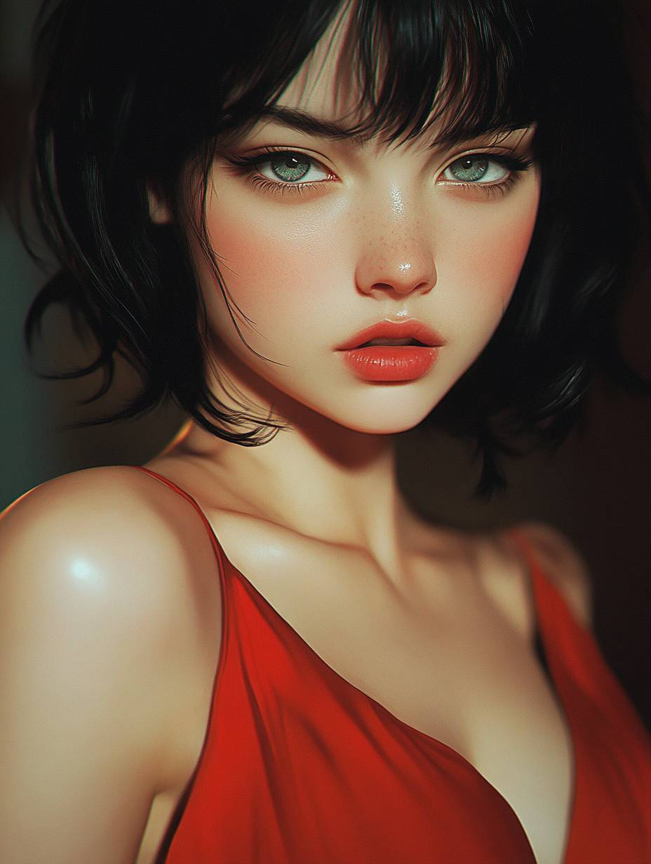 Um close-up de uma mulher em um vestido vermelho, pintura fotorealista