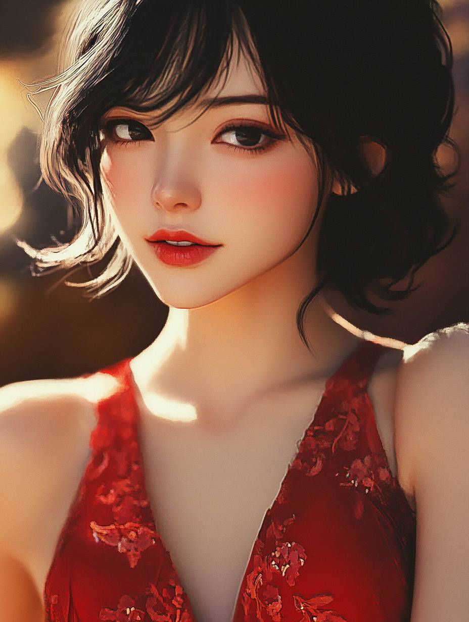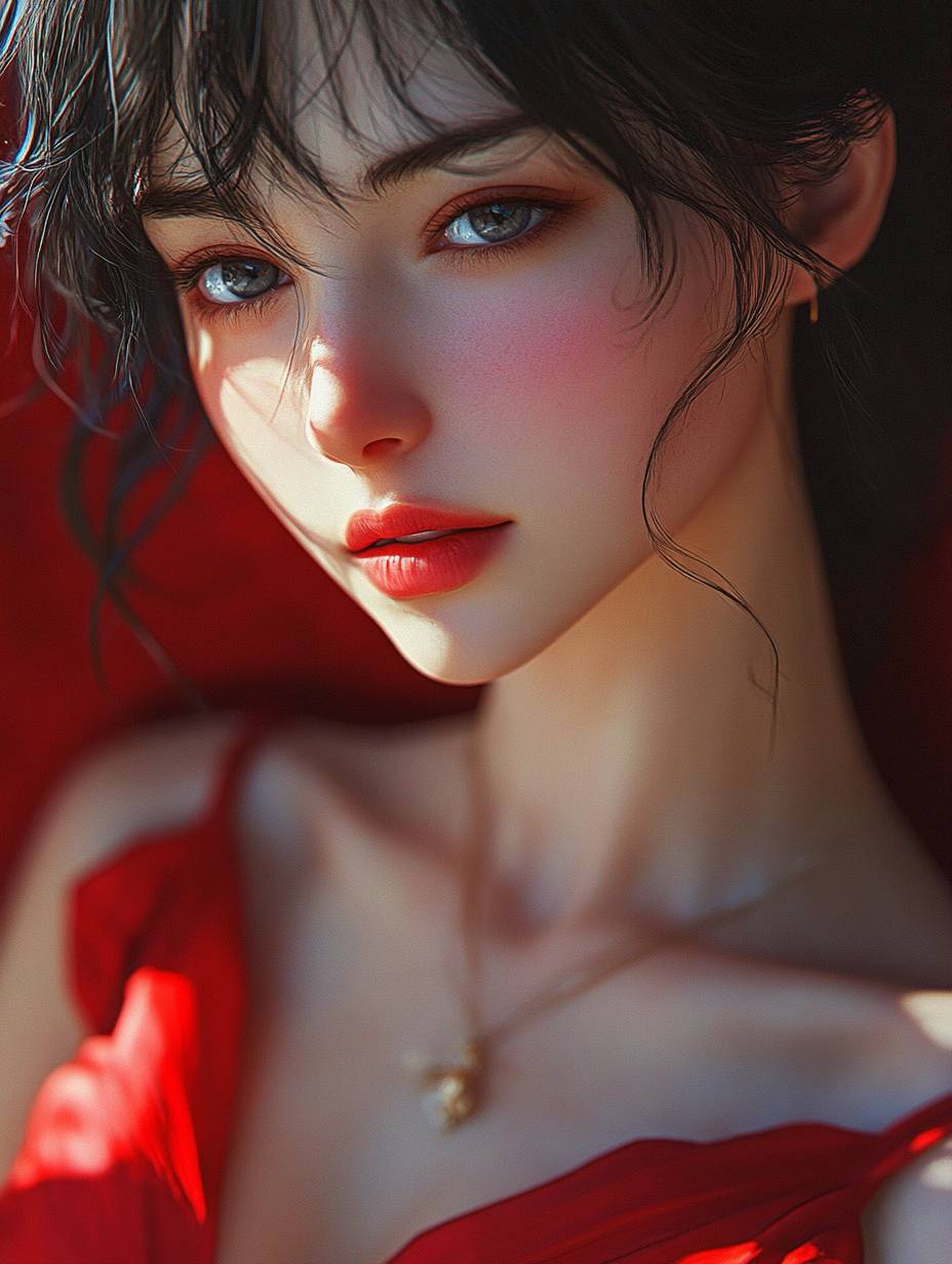 a close up of a woman in a red dress, a photorealistic painting by Lü Ji, cgsociety, ukiyo-e, artstyle : ilya kuvshinov, cgsociety 9, anime character; full body art --ar 3:4 --v 6.1