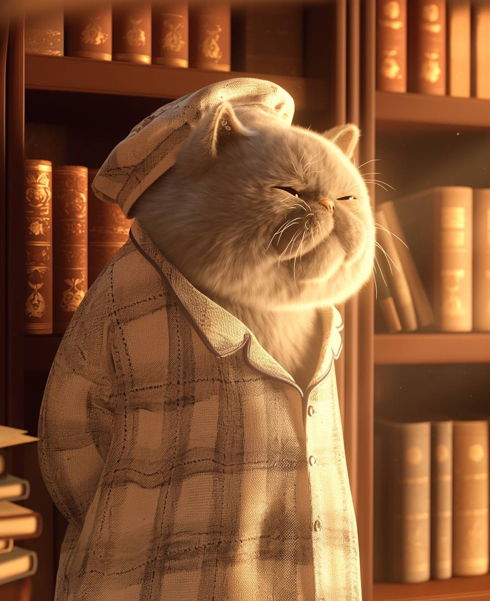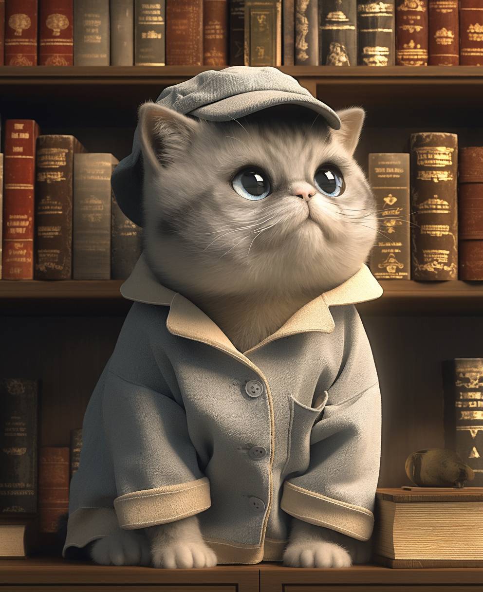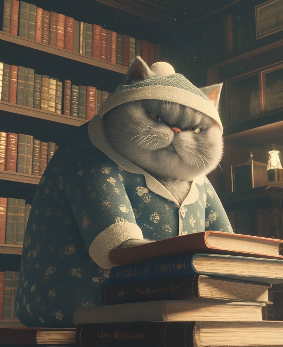 Estilo de caixa misteriosa, vista de ombro, lente de meio corpo, um gato britânico Shorthair fofo e gordinho, nas cores cinza e branco, vestindo pijamas macios e um gorro de noite. O gato está olhando para a estante com muitos livros antigos, com um sorriso de satisfação, proporções chibi, C4D captura detalhes, tecnologia de renderização Octane, imagem realista, iluminação de borda contorna e iluminação dramática melhora a atmosfera. Resolução 8K, qualidade de imagem em alta definição.