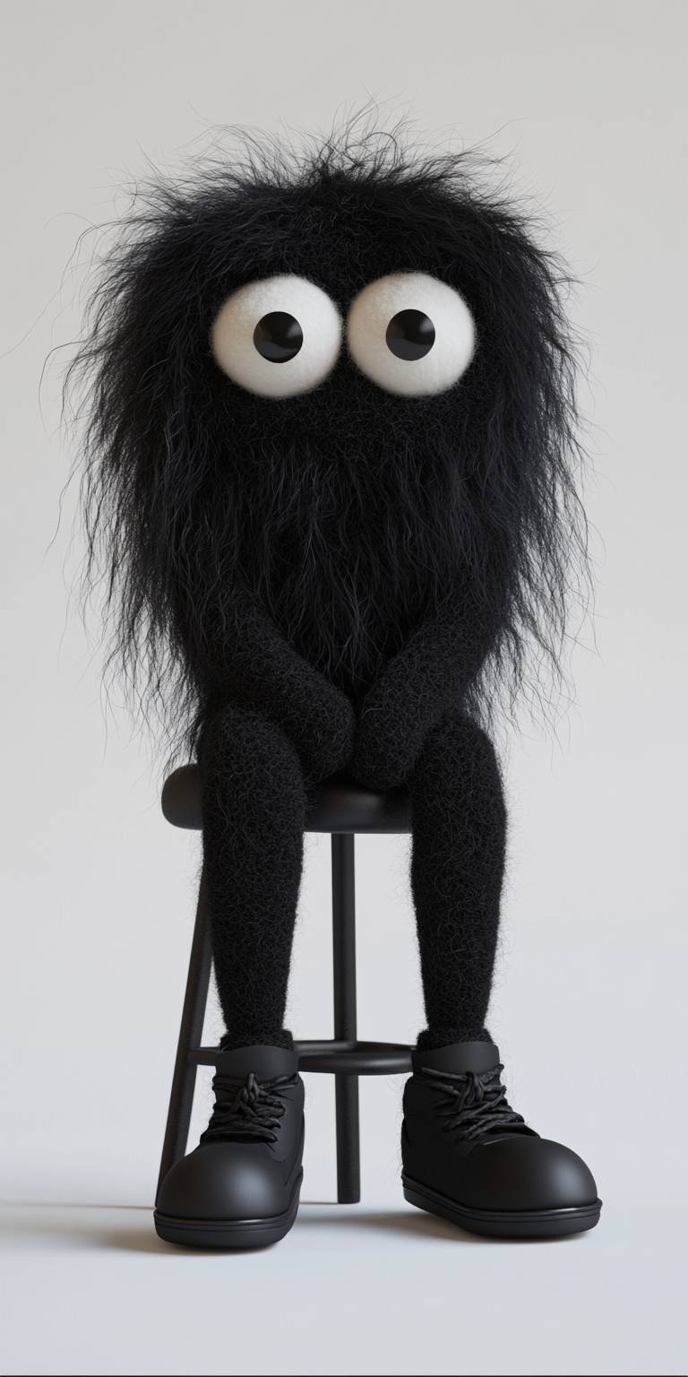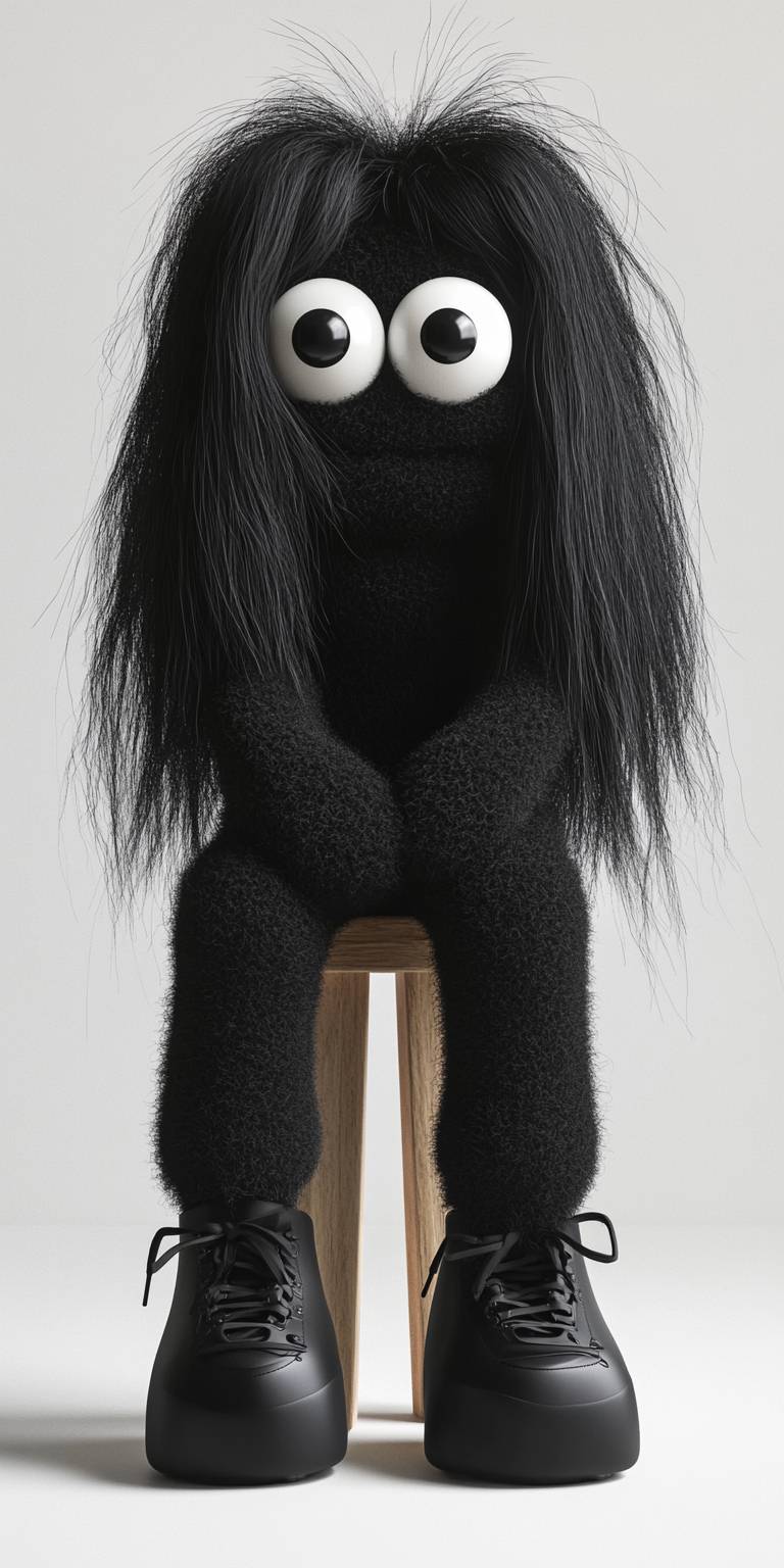 A cute little monster sitting on a stool, wearing black and shoes, with long hair covering its face. It has big eyes with a smiling expression, set against a white background. This is a full-body photo in a simple style, depicting a blind box toy model made of felt material. The image appears to be a C4D rendering with studio lighting, showcasing high-definition details in 32K HD. --ar 1:2