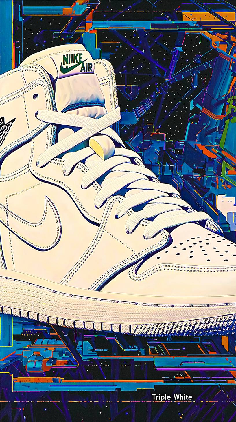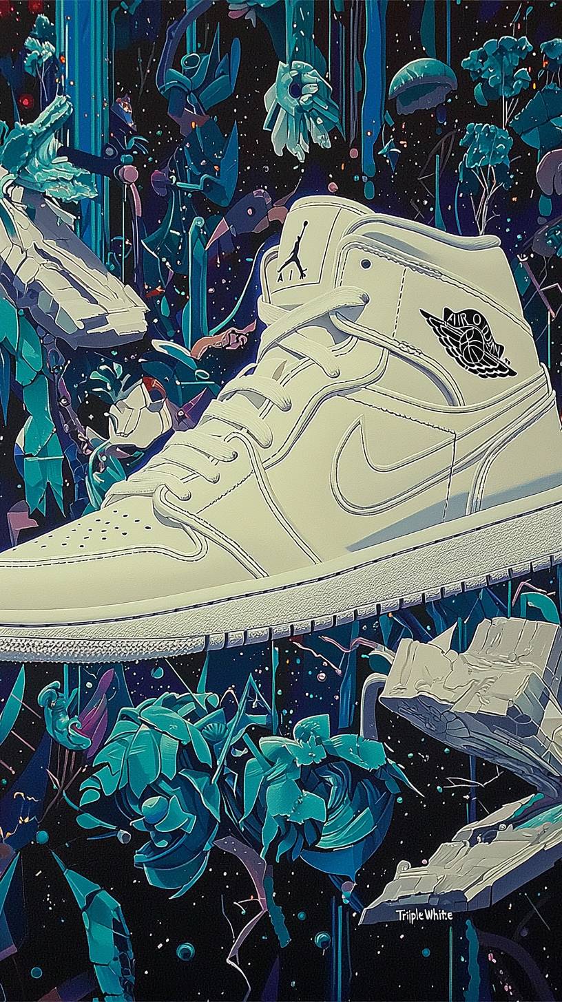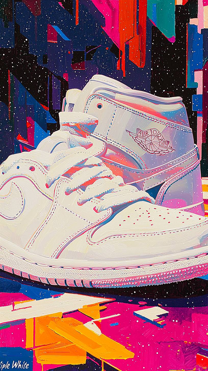 expert oil painting of an astral Projection of Nike air Jordan retro, Nike air Jordan shoe, "Triple White" Crisp all-white design, featuring smooth white leather with a matching sole and laces, all white air jordan retro, blink-and-you-miss-it detail, optical illusion behind, optical illusion background, in classical style, glistening details, colorful color theme, intricate detail --no red --ar 9:16 --quality 2 --style raw --personalize vkkjlx5 --stylize 1000 --v 6.1