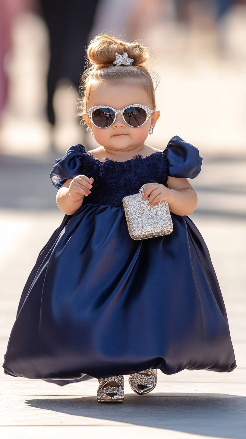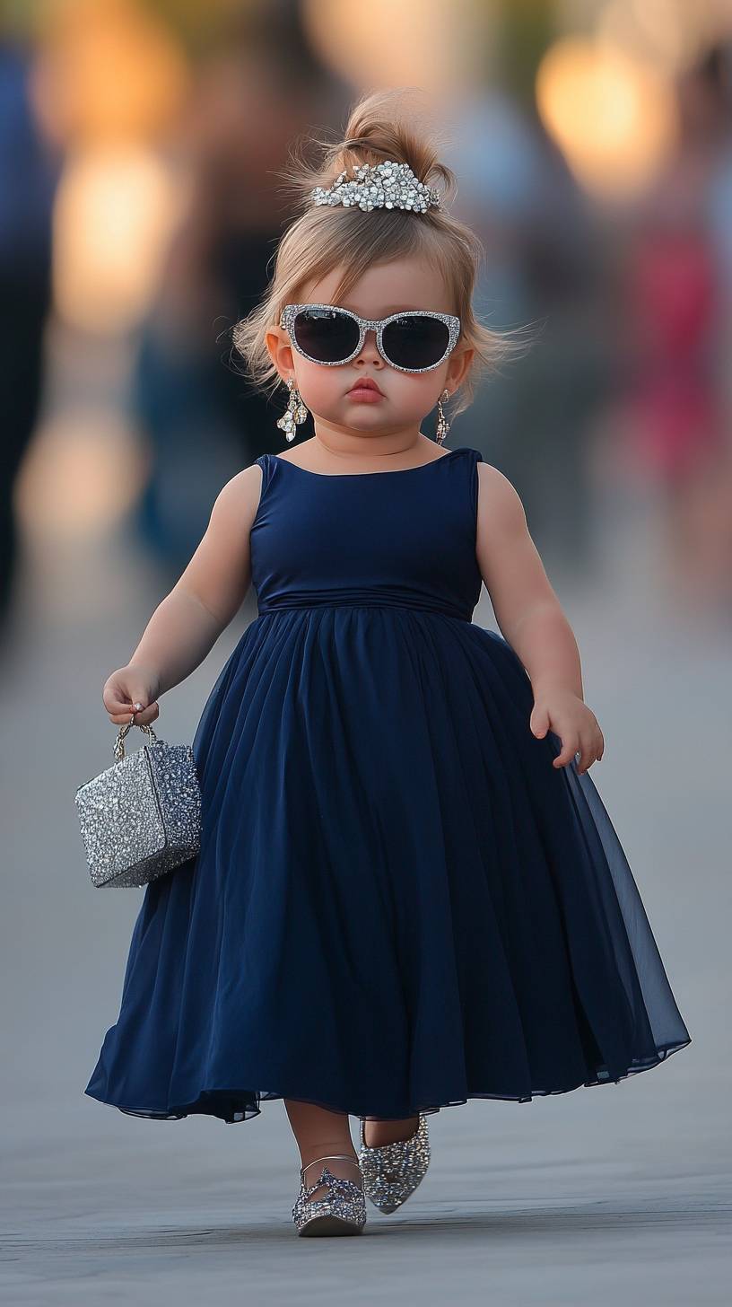 Uma menina americana gordinha de 1 ano, com uma figura de barriguinha de bebê extremamente exagerada e bochechas gordinhas, usando óculos de sol, seu rosto redondo e figura rechonchuda acrescentam à sua atitude fofa e ousada. Ela usava um vestido de noite azul-marinho de seda que mostrava sua elegância e graça. Combinado com saltos altos prateados e brincos de cristal, ela segurava uma clutch delicada na mão e usava uma maquiagem deslumbrante e um penteado real. Suas bochechas redondas, rosto gordinho e expressão brincalhona a faziam parecer tanto fofa quanto divertida. Ela anda confiantemente pela passarela como se a passarela pertencesse a ela, com a passarela no centro ao fundo, e o suave bokeh de fundo destaca sua presença. Estilo de fotografia digital em HD, fotorealista, estilo realista, qualidade superior, ultra HD.