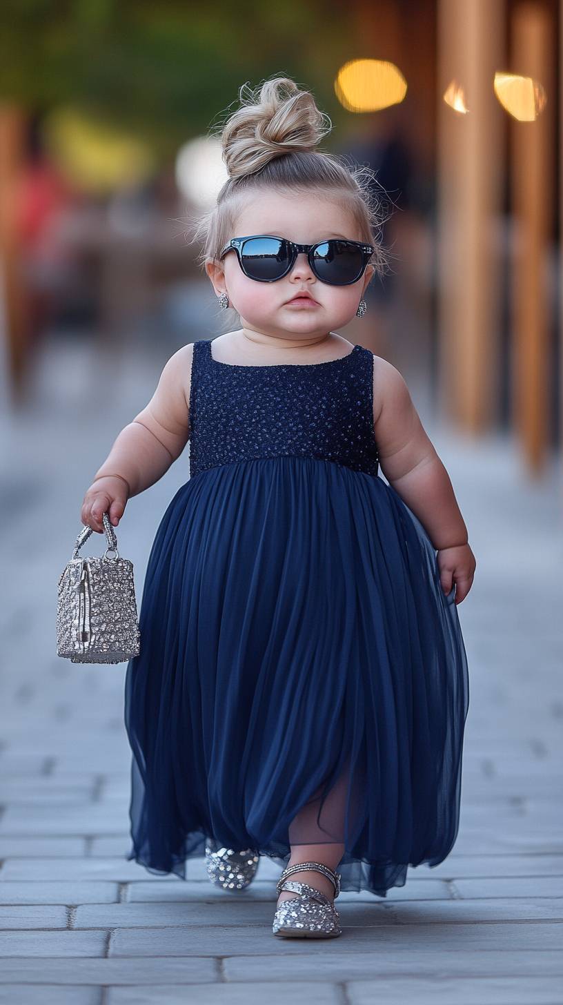 A chubby American 1 year old baby girl with an extremely exaggerated baby bump figure and chubby cheeks, wearing sunglasses, her round face and plump figure add to her cute and bold demeanor. She wore a navy blue evening gown made of silk that showed off her elegance and grace. Paired with silver high heels and crystal earrings, she held a delicate clutch in her hand and wore gorgeous makeup and a regal coiffed hairstyle. Her round cheeks, chubby face and playful expression made her look both cute and fun. She walks confidently down the runway show as if the runway belongs to her, with the catwalk in the middle of the runway in the background, and the soft background bokeh highlights her presence. HD digital photography style, photo-realistic, realistic style, top quality, ultra HD. plus-sized --ar 9:16 --v 6.1