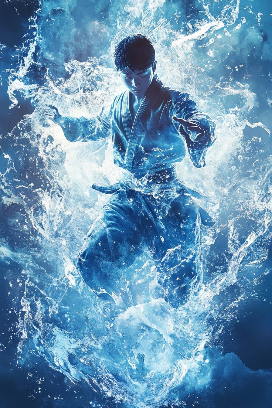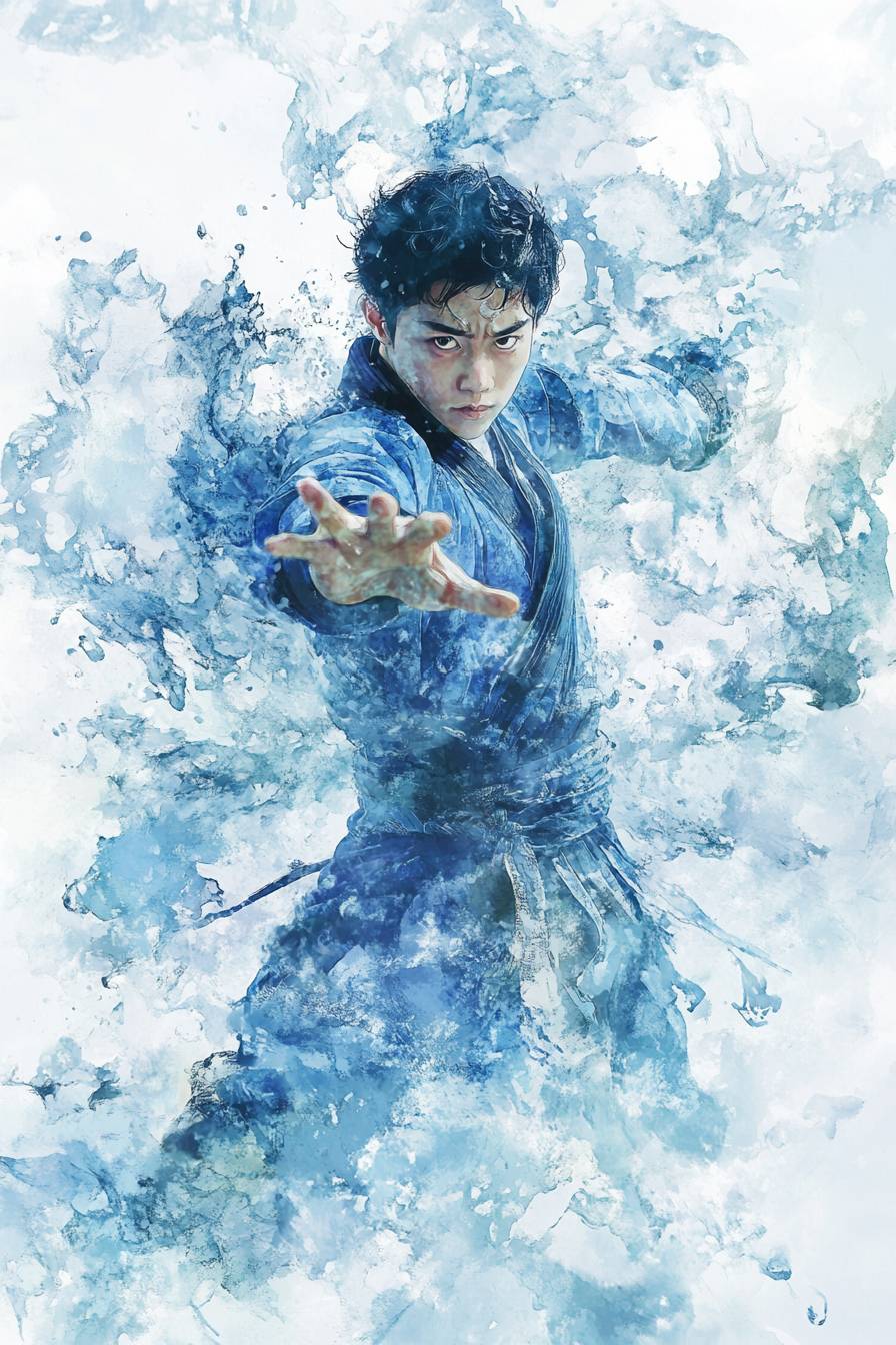 Um congelamento cinematográfico, garoto do kung fu, roupas líquidas do elemento água, estilo aquarela, vibrações artísticas dinâmicas, vibrações dinâmicas das emoções da água