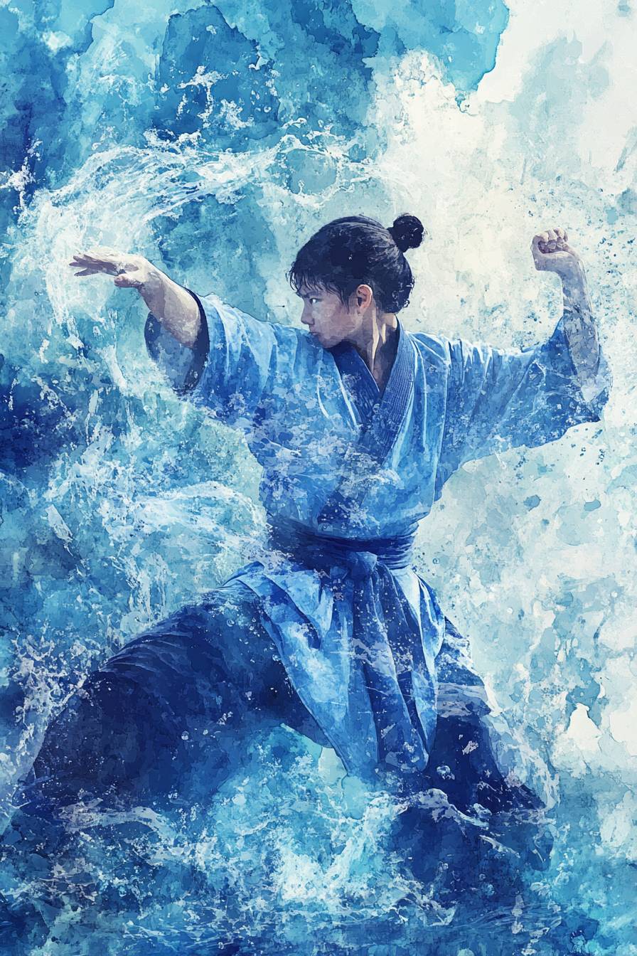 A cinematic freeze, kung fu kid, water element liquid clothes, liquid clothes, watercolor style, artistic vibes dynamic, water emotions vibes dynamic --v 6.1 --ar 2:3