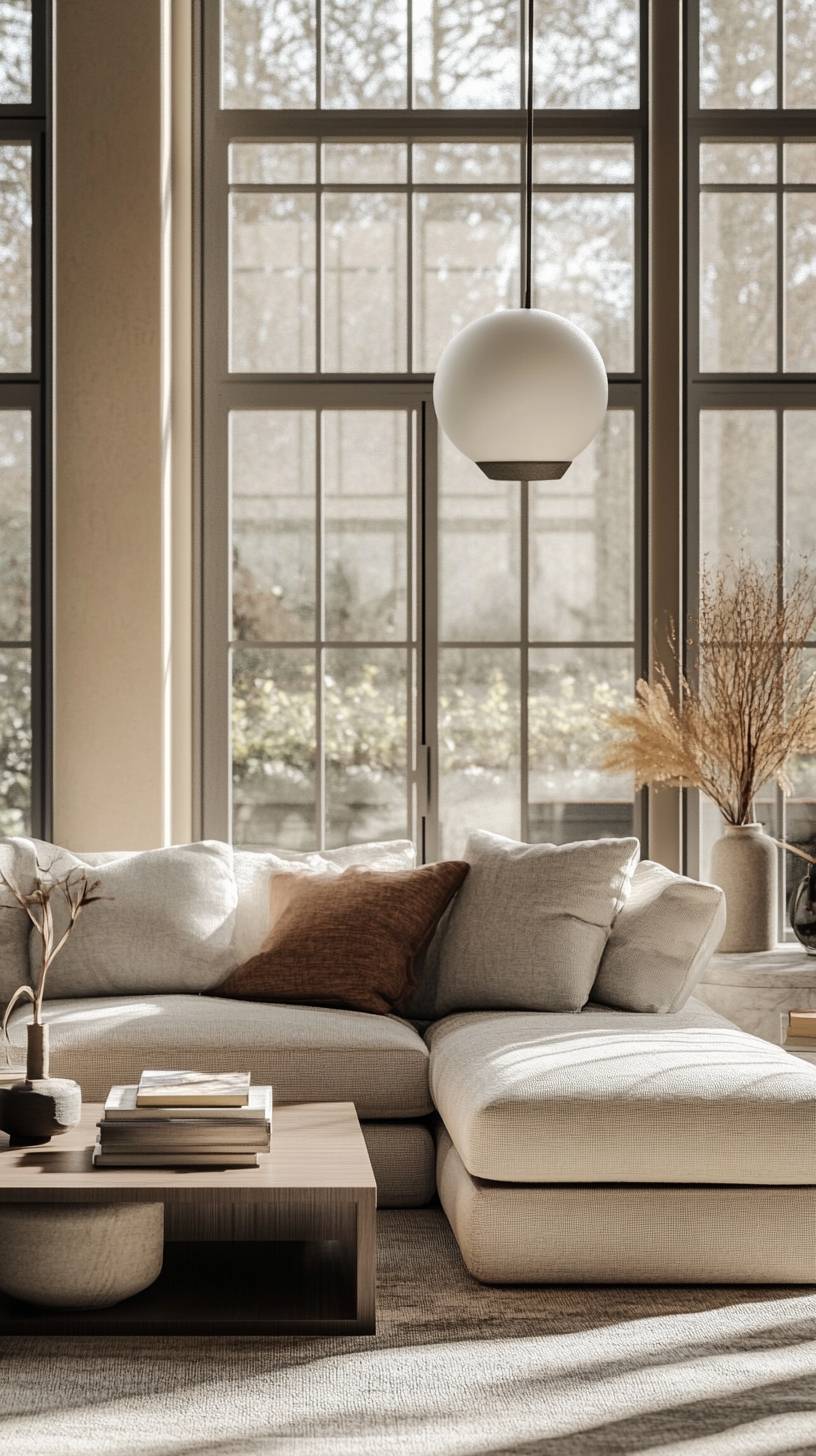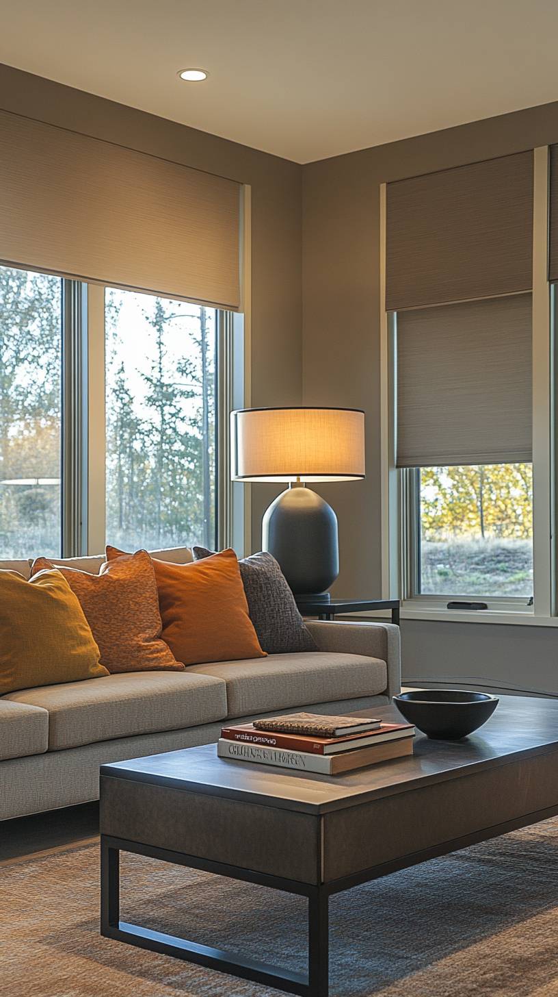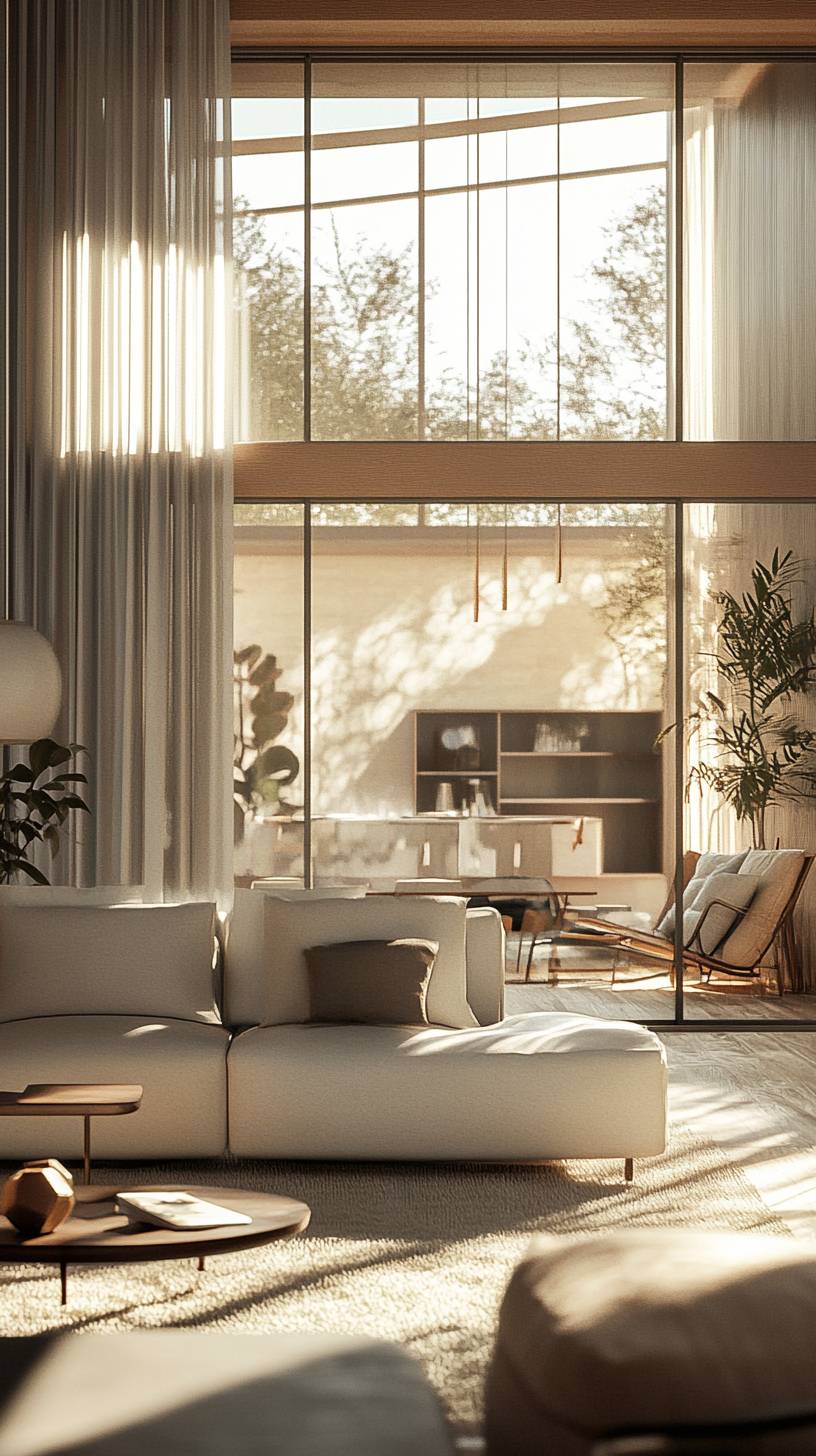 A thoughtfully designed livingroom showcasing a combination of warm, neutral, and cool lighting. Natural sunlight streams through large windows, harmonizing with artificial lighting from modern accent lamps that highlight specific areas. The lighting is layered to create different atmospheres: warm, golden light for cozy corners, neutral lighting for a balanced ambiance, and cool, blue-toned light for focused work areas. The intensity of the light shifts throughout the space, playing with shadows and brightness to transform the room’s mood and functionality. Hyper realistic --ar 9:16 --v 6.1