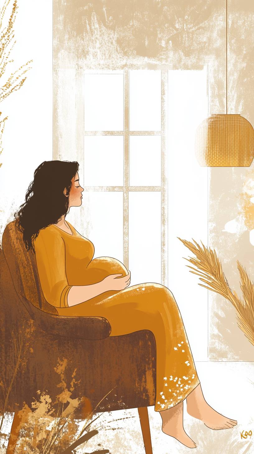 An illustrative scene featuring a pregnant woman thinking while sitting In a sofa , warm brown and soft yellow colour theme --ar 9:16 --v 6.1