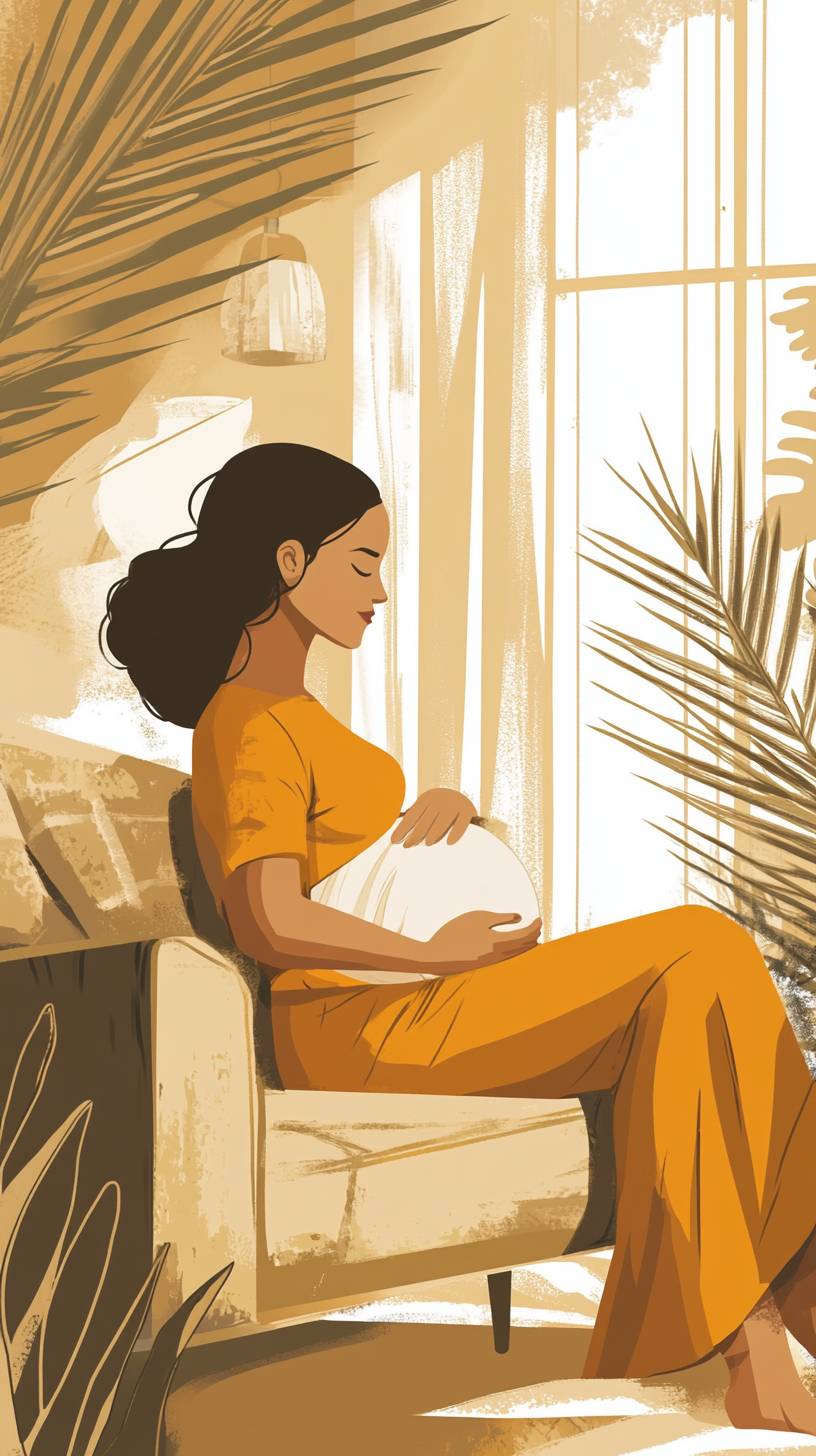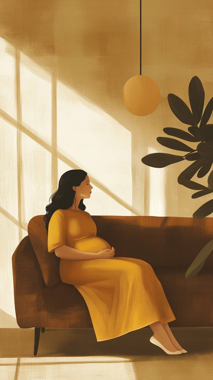 Uma cena ilustrativa apresentando uma mulher grávida pensando enquanto está sentada em um sofá, com um tema de cores marrom quente e amarelo suave.