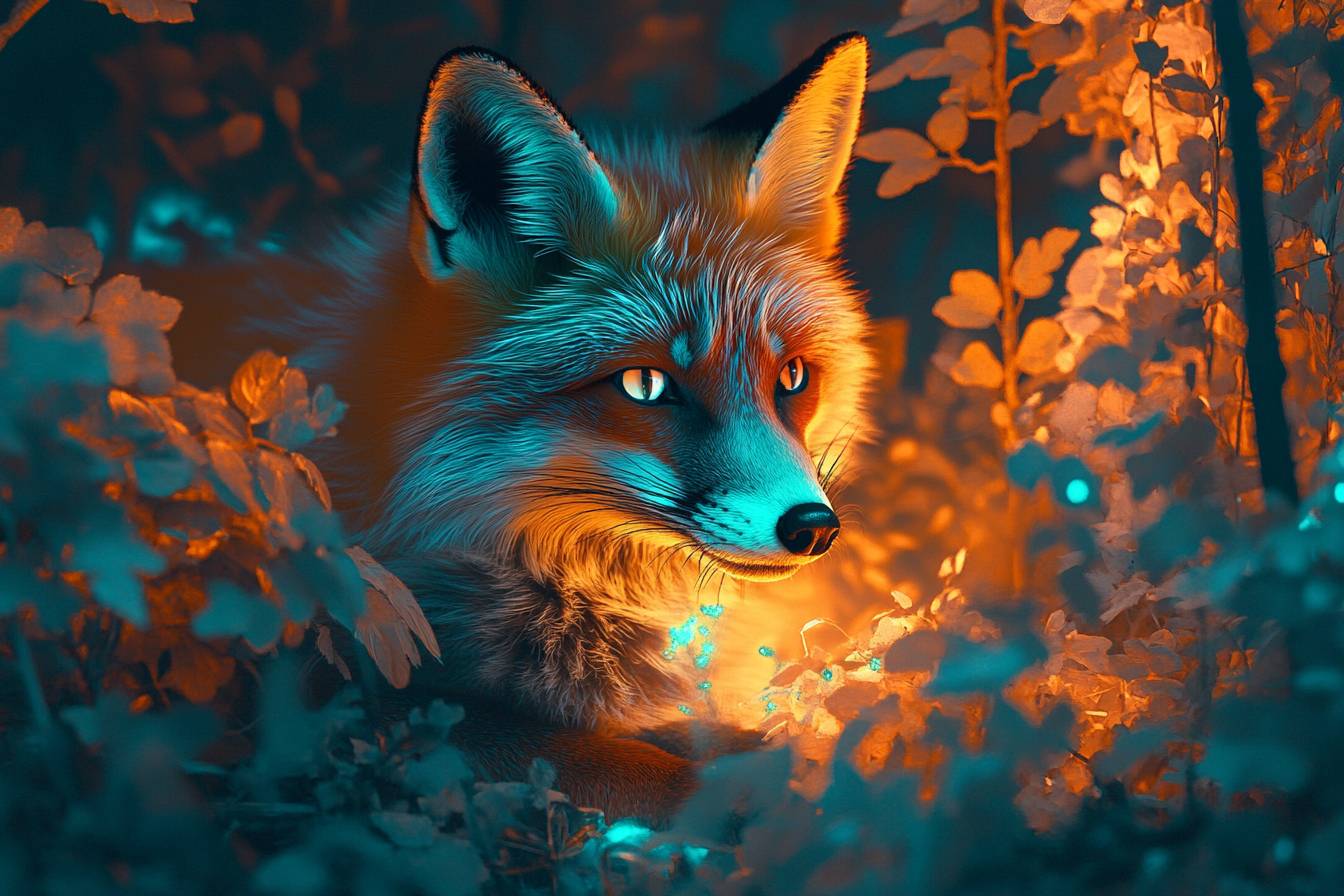 A fox illuminated in a scene of Luminescent Bioluminescence, surrounded by glowing flora and fauna of the enchanted forest. Use vibrant shades of orange and teal to enhance the ethereal glow --ar 3:2 --style raw