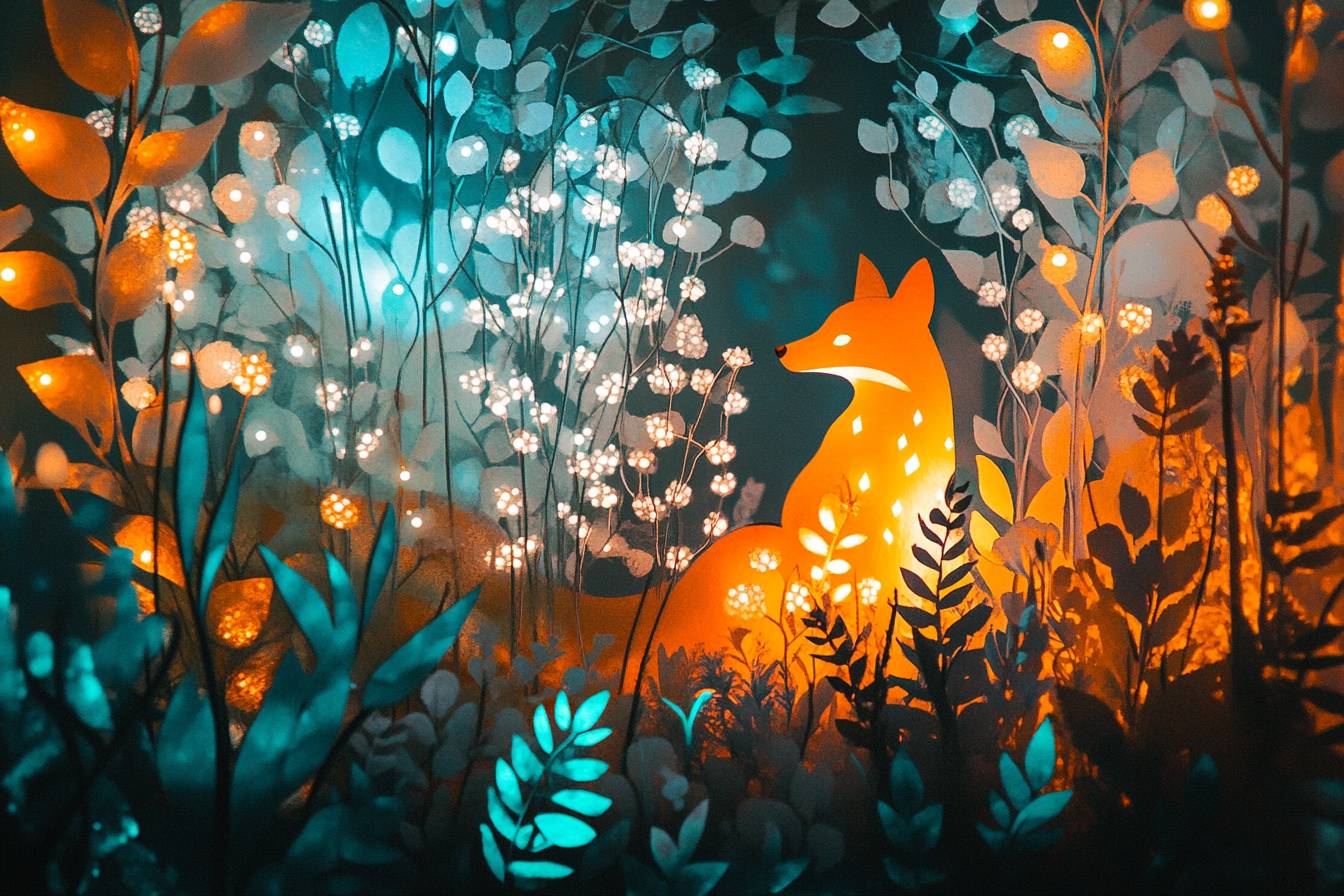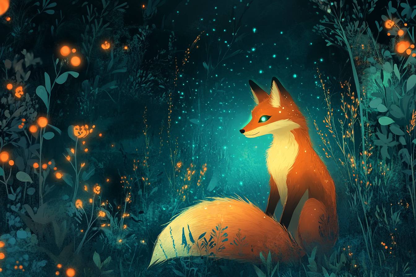 Uma raposa brilhante cercada por plantas bioluminescentes em uma floresta encantada.