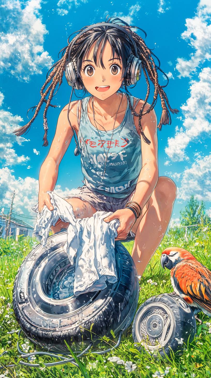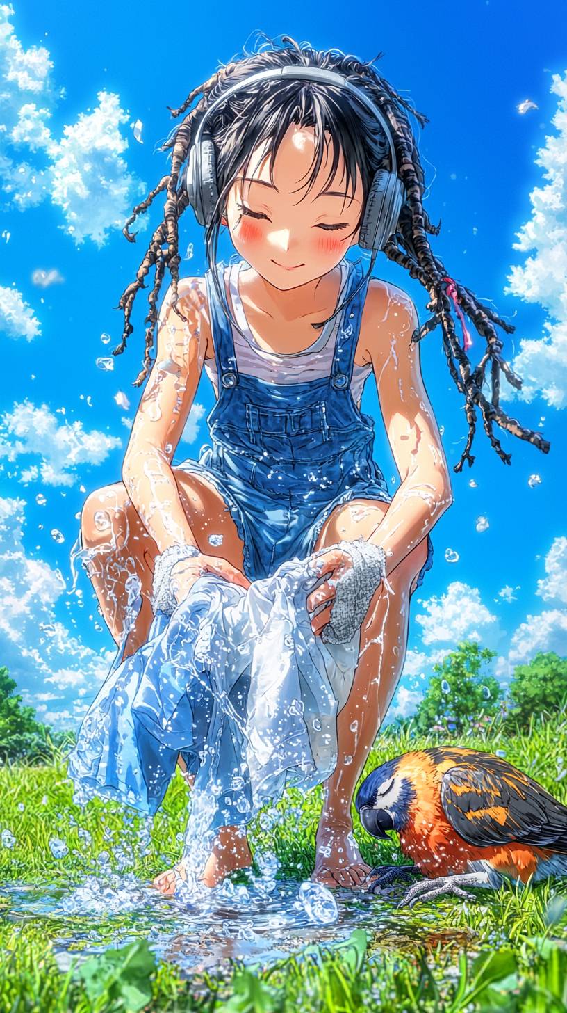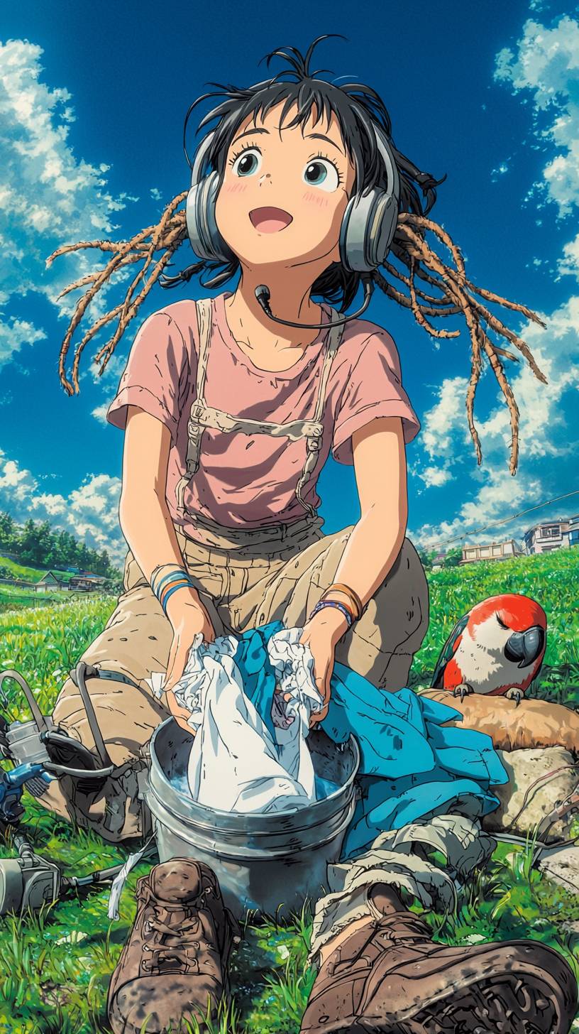 Anime illustration in studio ghibli style by Makoto Shinkai of An anime young girl washing clothes on.hands outside, in the middle of a green meadow with two arms what to use, wearing headphones, dreadlocks long hair, and a animal parrott sleeping next to boy, overlooking the angle, looking down from a distance, 8k resolution --no umbrella, photo-realistic, low quality, child, backpack, lowres, watermark --chaos 22 --ar 9:16 --quality 2 --personalize gokh7pq --stylize 1000 --v 6.1