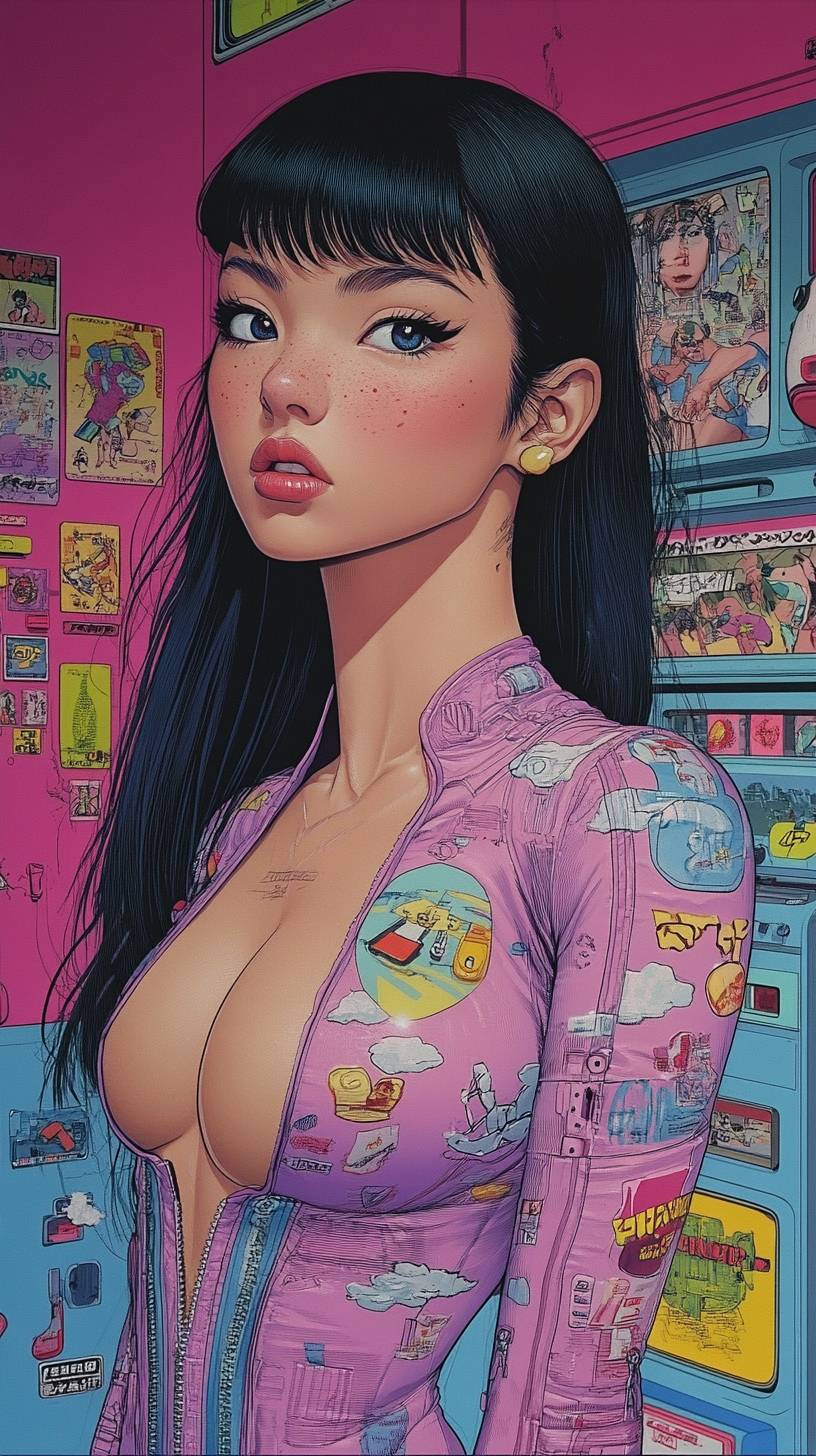 Imagine uma bela mulher em um traje plástico futurista, influenciada por Masamune Shirow, Gil Elvgren e Hajime Sorayama, ambientada em um ambiente cyberpunk, no estilo do anime dos anos 80, close-up, captura de tela de TV vintage, hiper detalhada, hiper realista.