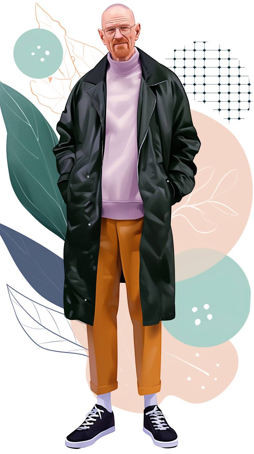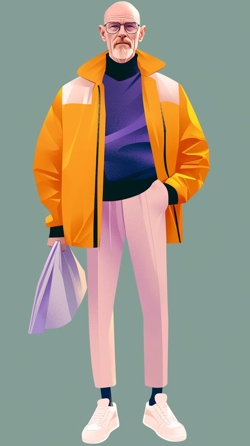 Um desenho simples de Walter White, com linhas simples, cores planas e estilo de boneco palito, minimalista, fundo simples.