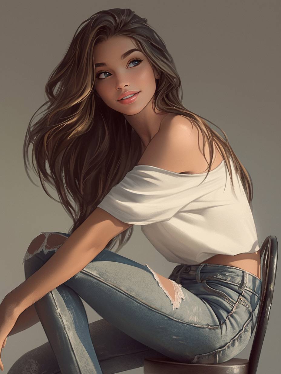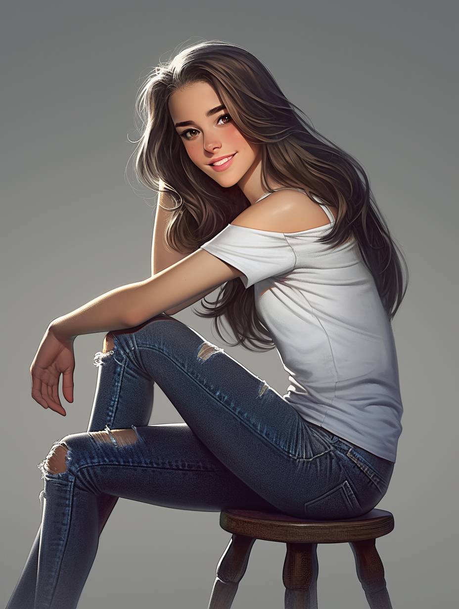 full length beautiful young brunette woman is smiling, dressed in torn jeans and a white T-shirt, sitting sideways on the back of the chair, on a gray background, ring light, by Magali Villeneuve, beautiful face, hyper realistic, ultra-detailed, soft light --ar 3:4 --niji 6