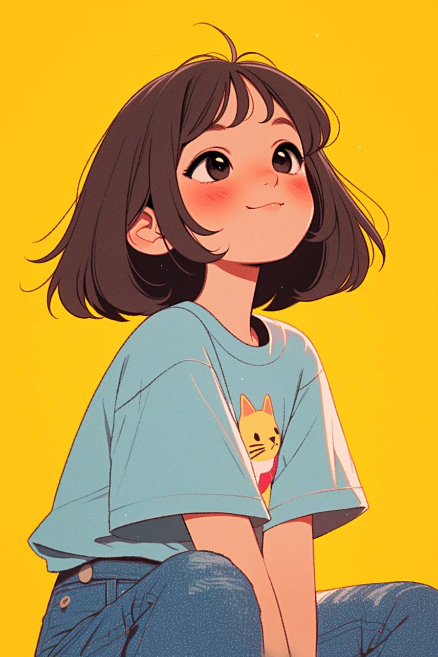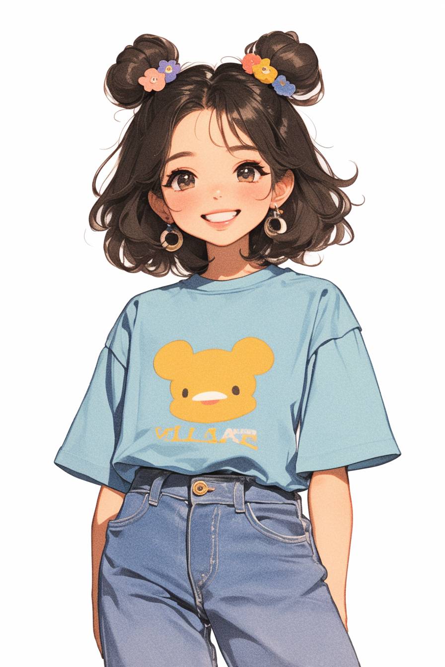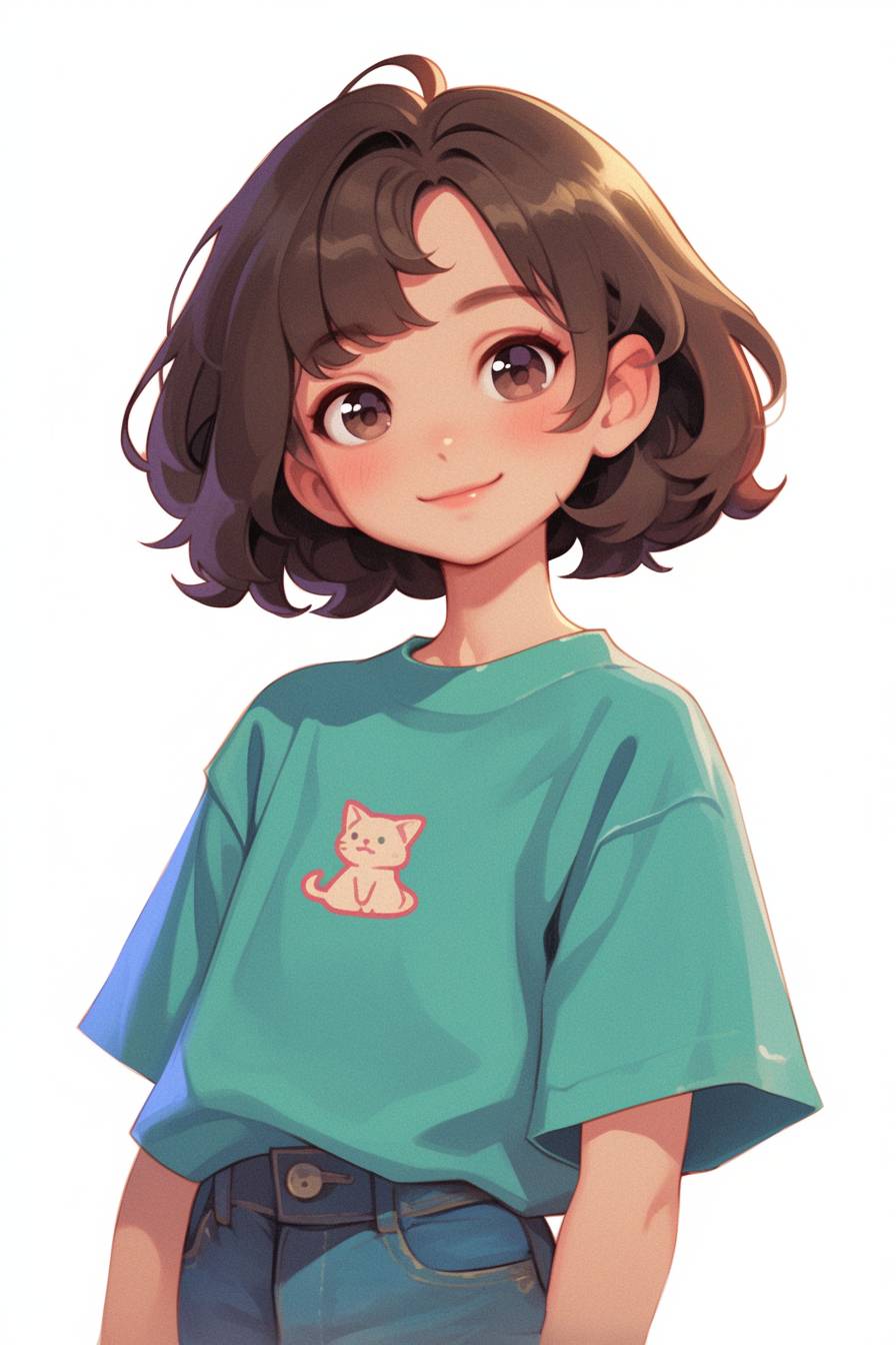 a little girl wearing a teal t-shirt and blue jeans smiled at me, illustrations, digital art, using vivid colors such as blue, yellow, green, etc., to create a slightly relaxed and witty atmosphere of the scene, with detailed character design, cute style. --ar 2:3 --stylize 1000 --niji 6