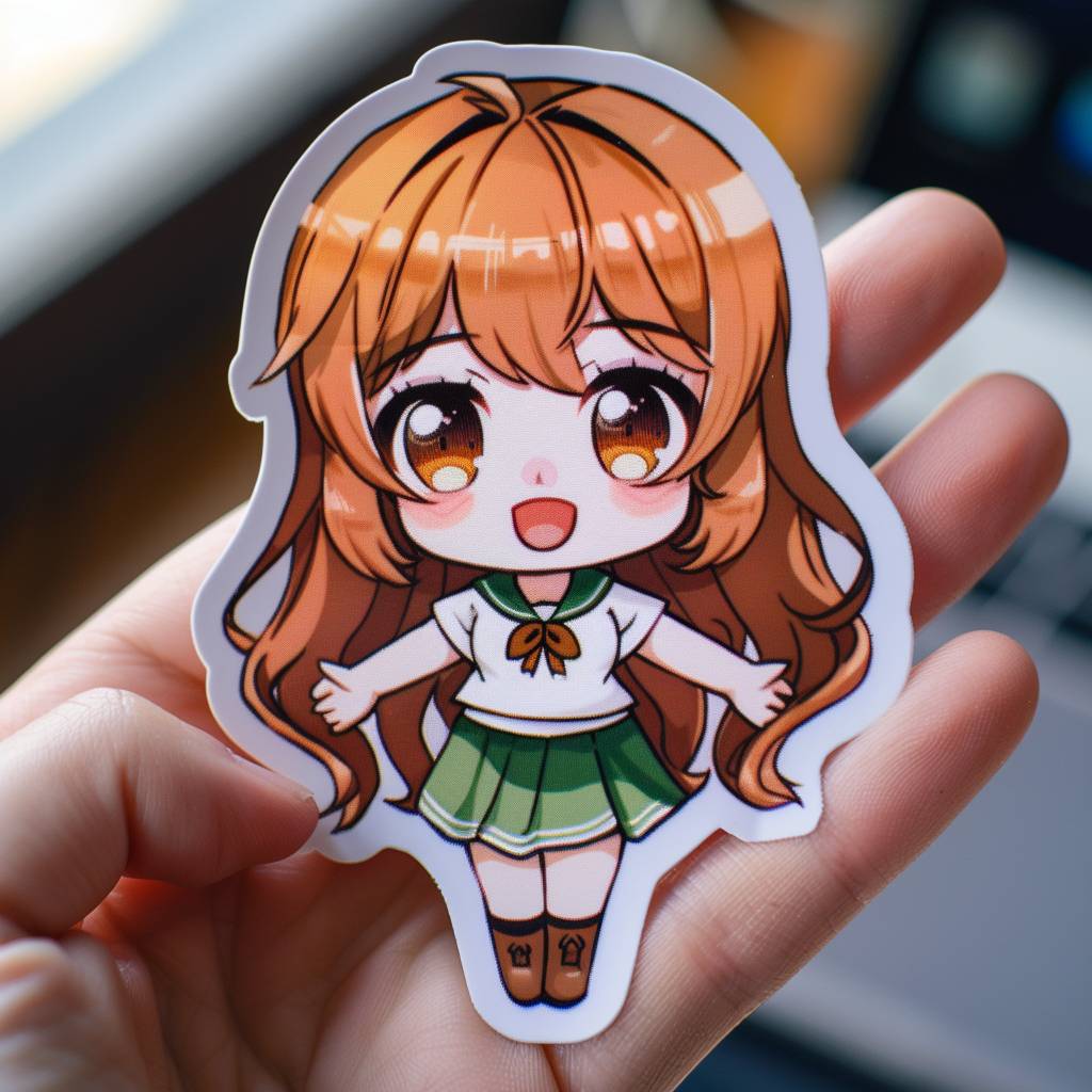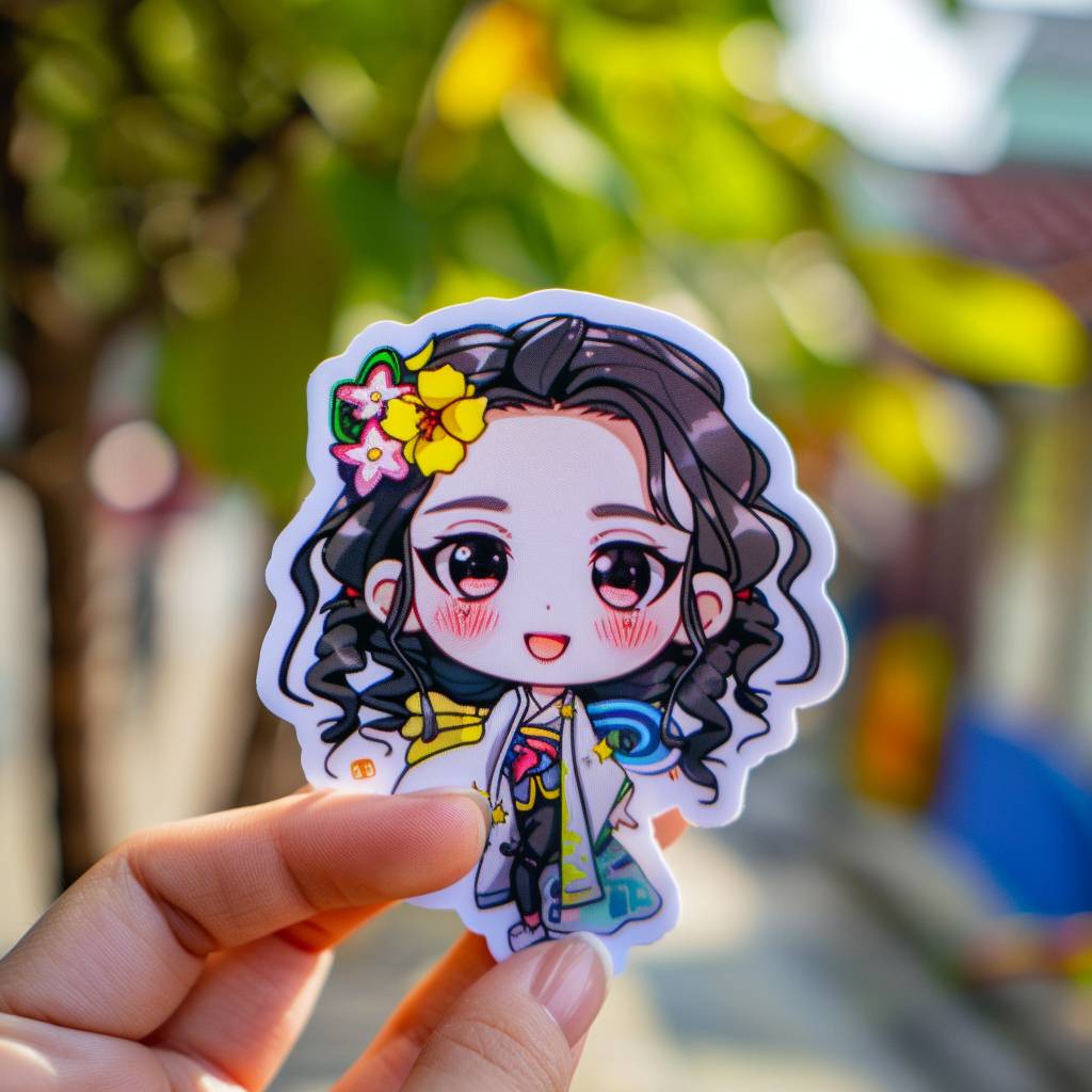 Uma mão segurando um adesivo de personagem chibi altamente detalhado e realista, com um fundo colorido.