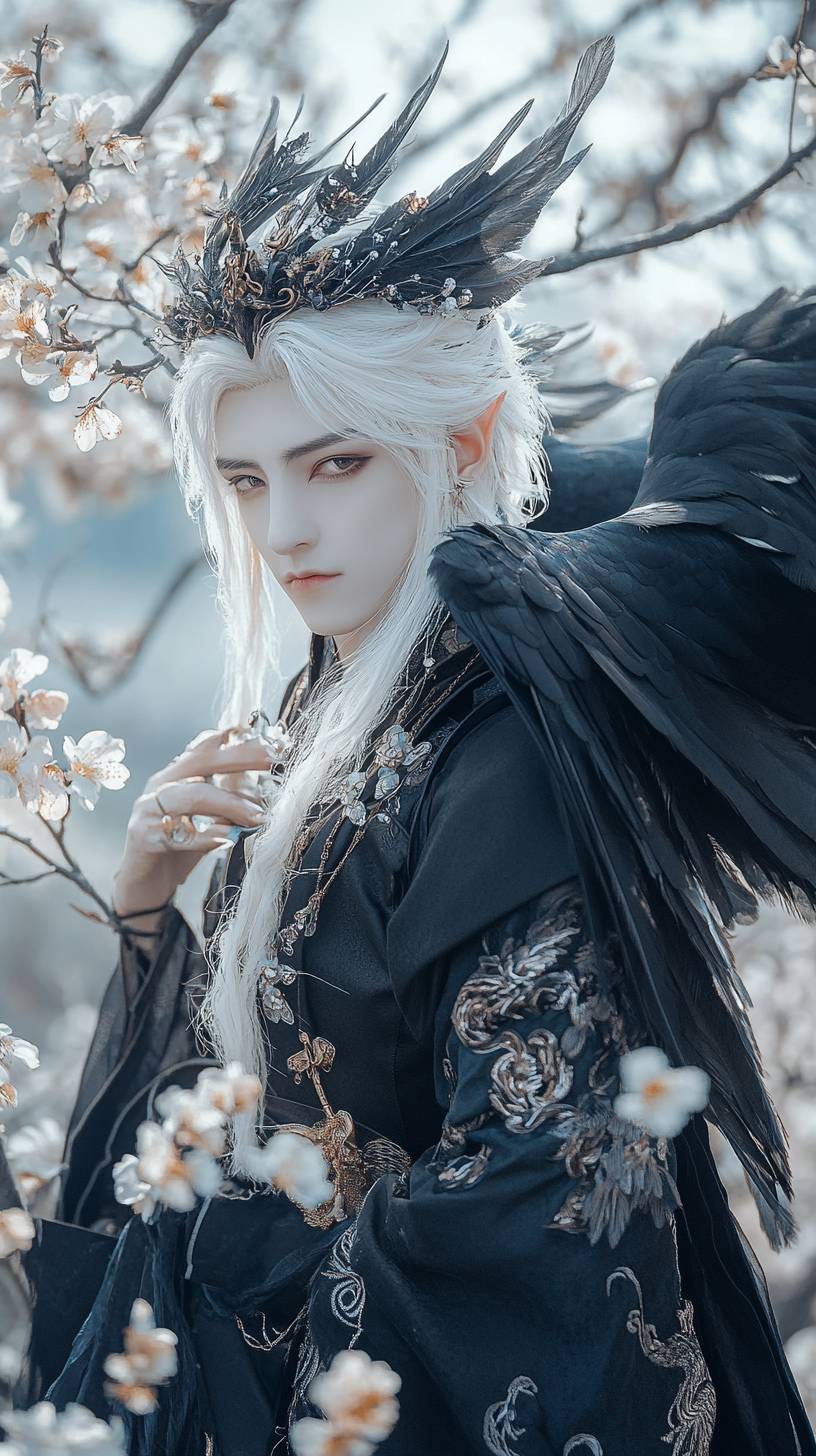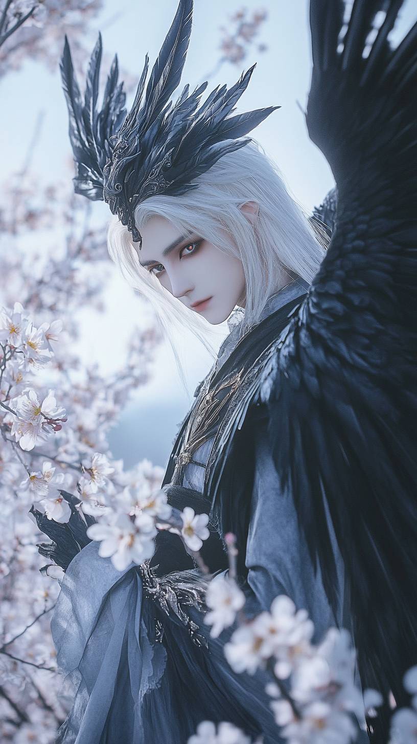 Pessoa com cabeça de corvo, demônio corvo, jovem bonito em gaze azul antiga, coroa de cabelo de corvo, cabelo branco esvoaçando, vestes esvoaçando, em pé em um galho de flor, o fundo é um céu limpo, composição de filme, foto real, super alta definição, 8k