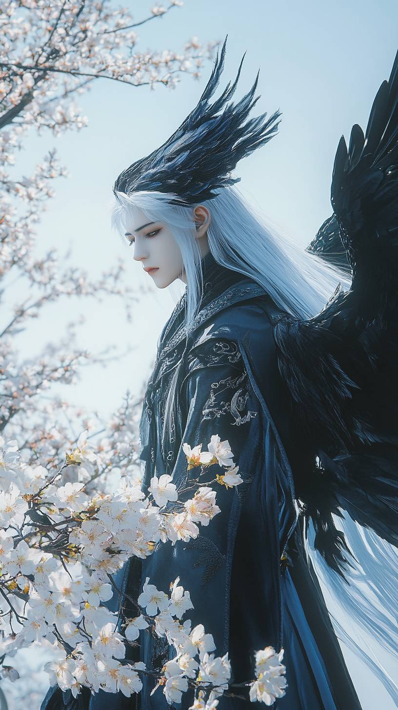 crow head person crow demon, ancient blue gauze handsome young man, crow hair crown, white hair fluttering, yiwei fluttering, standing on a flower branch, the background is a clean sky, movie composition, real photoing, super high definition, 8k --ar 9:16 --v 6.1
