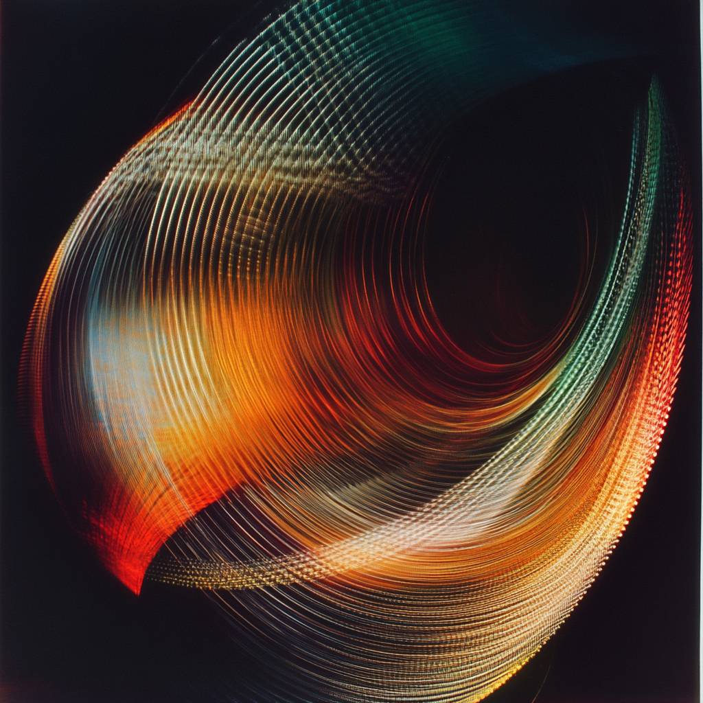 Contornos cósmicos, trilhas de luz abstratas, formas angulares e vanguardistas, criando movimento cinético com aberrações cromáticas