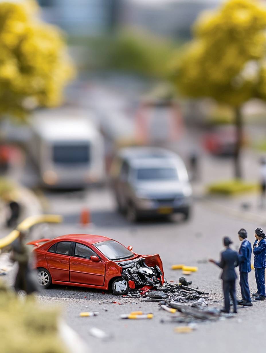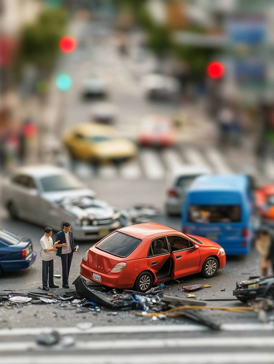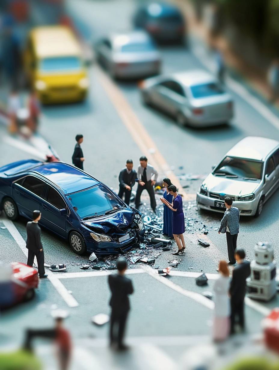 Car accident on the road, insurance company employees talk to the victim at the accident scene, TANAKA TATSUYA Style Miniature Art Photography --ar 3:4 --v 6.1