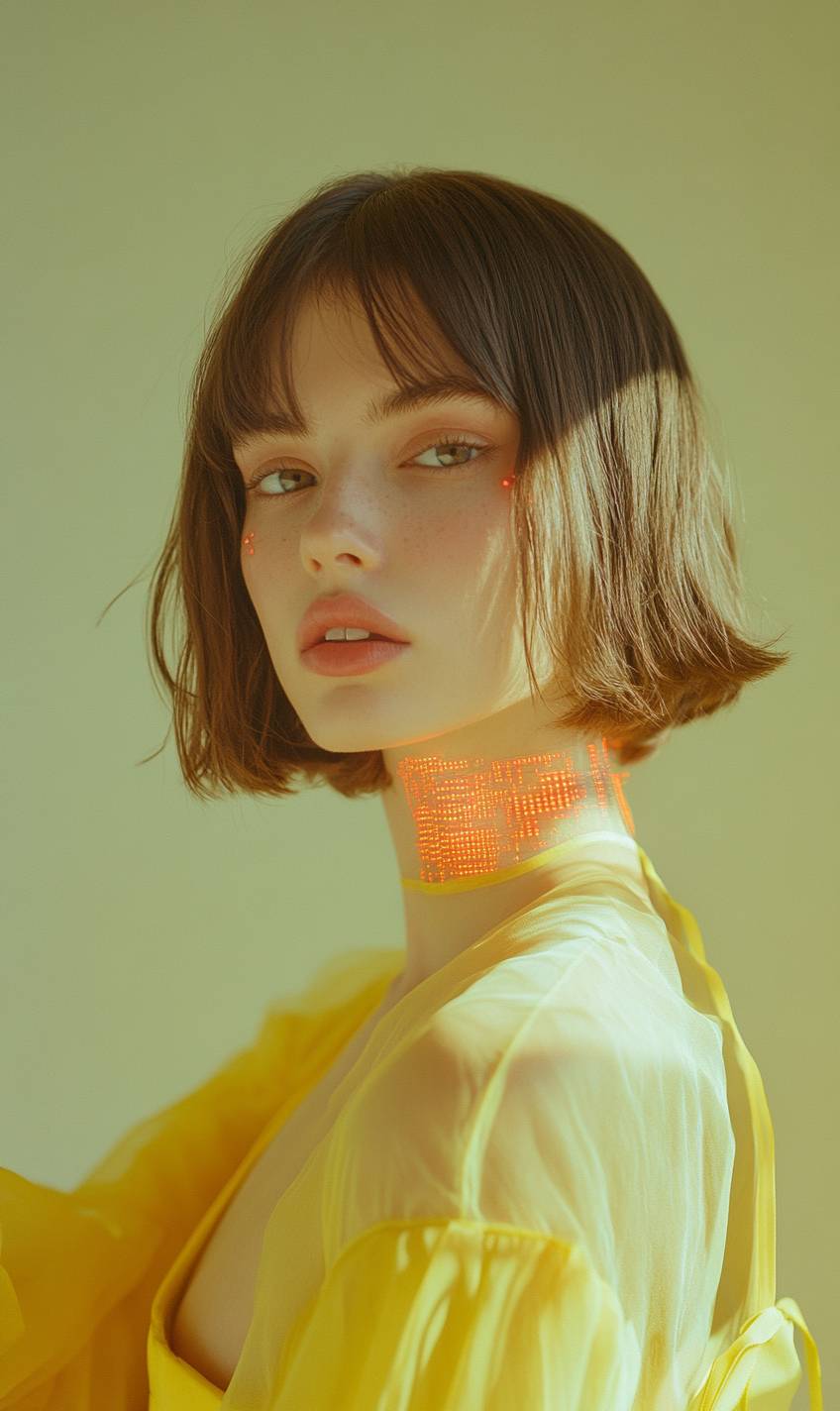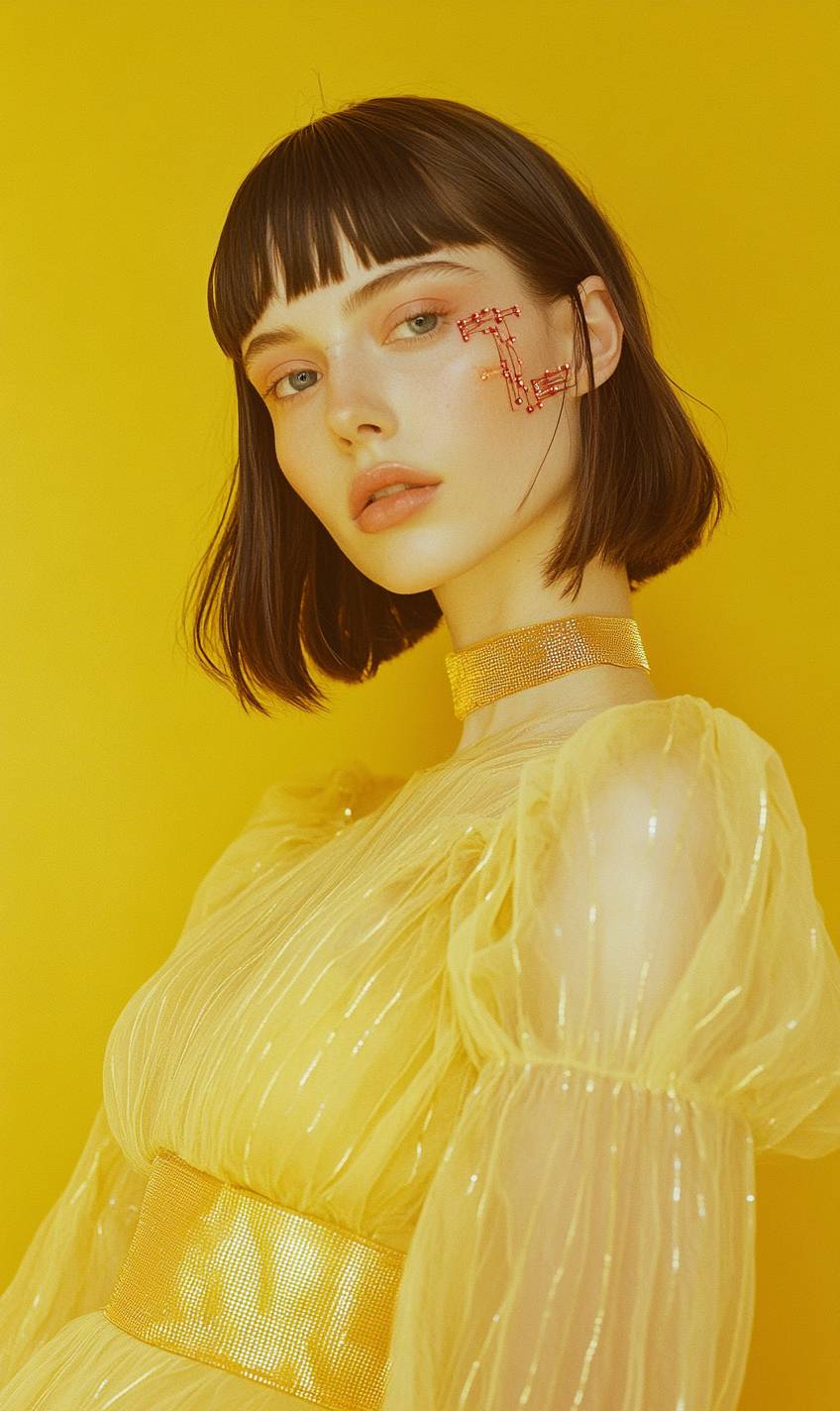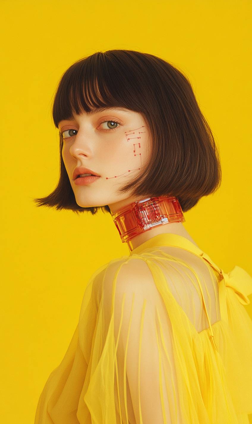 medium size shot, 3/4 profile looking at the camera, Hasselblad shot of a beautiful white woman with brunette bob hair in a sheer yellow satin minimalistic dress with a minimalistic satin belt at the waist, subtle cyborg features on face and neck with tiny, flat, thin, red, transparent electronic pieces inlaid on her skin, on a canary background, magazine style --ar 3:5