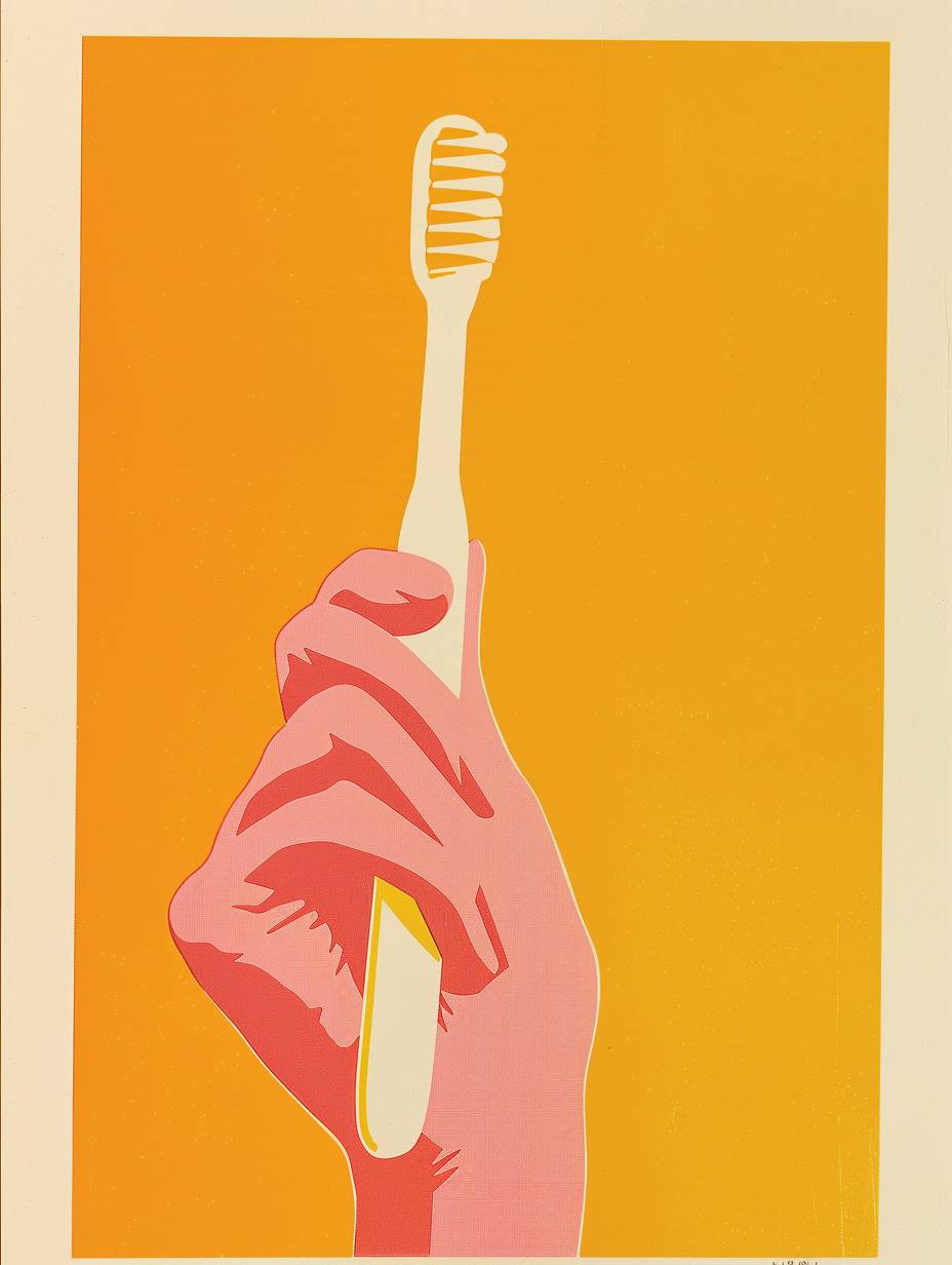 Um anúncio retro de estilo fauvista dos anos 60 apresentando a mão de uma criança segurando uma escova de dentes, projetado de forma simples, minimalista e humorística com cores neutras.