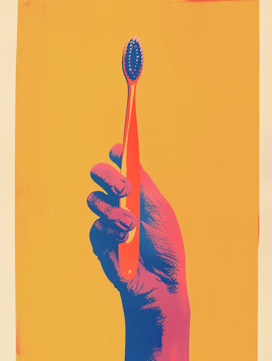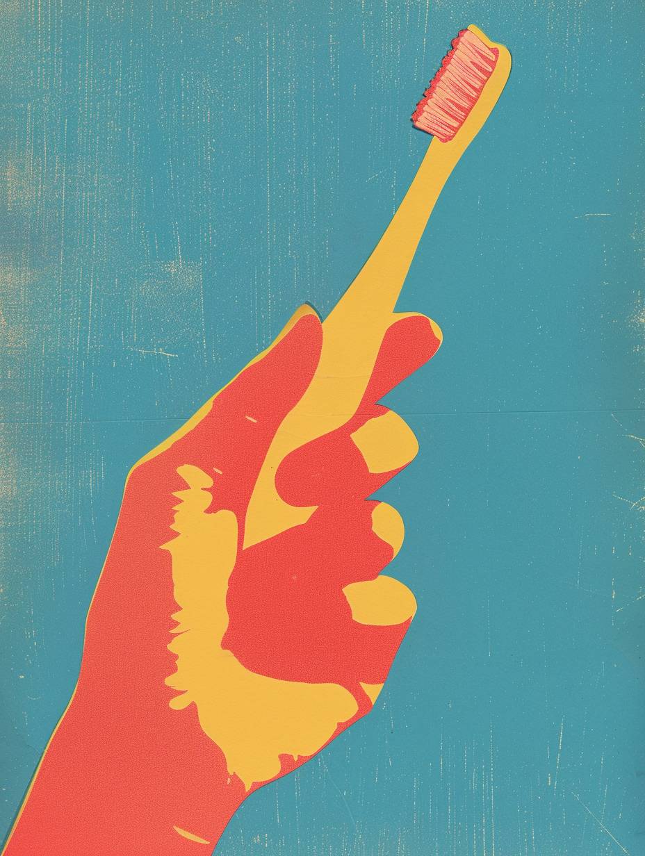 a fauvist-style, simple minimalistic, funny retro risograph of a kid's hand holding a toothbrush, 1960s ad with text, neutral colours--s 75 --ar 3:4 --v 6.0