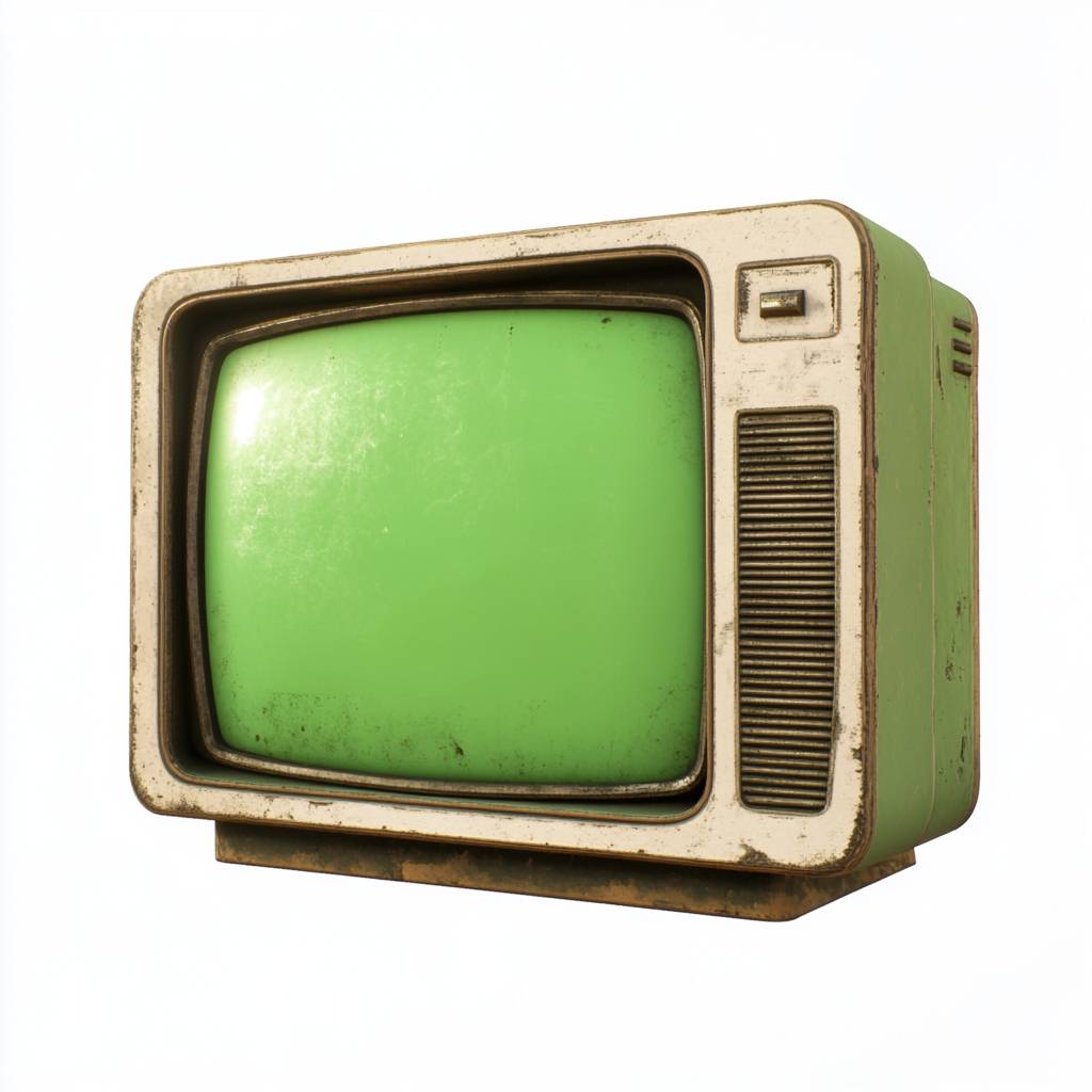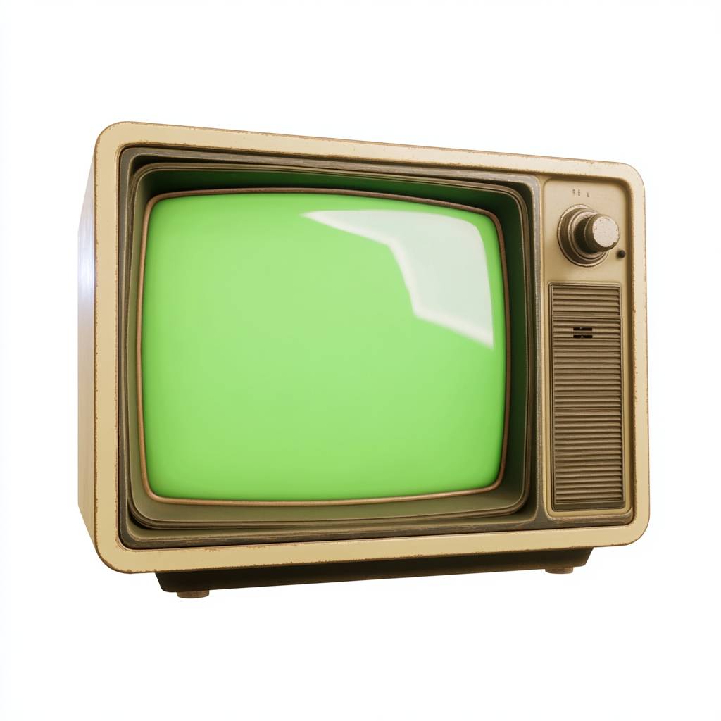 Uma TV antiga com tela de croma verde ácido plana. Estilo clássico dos anos 70. Fundo branco. Ativo 3D realista do Unreal Engine.
